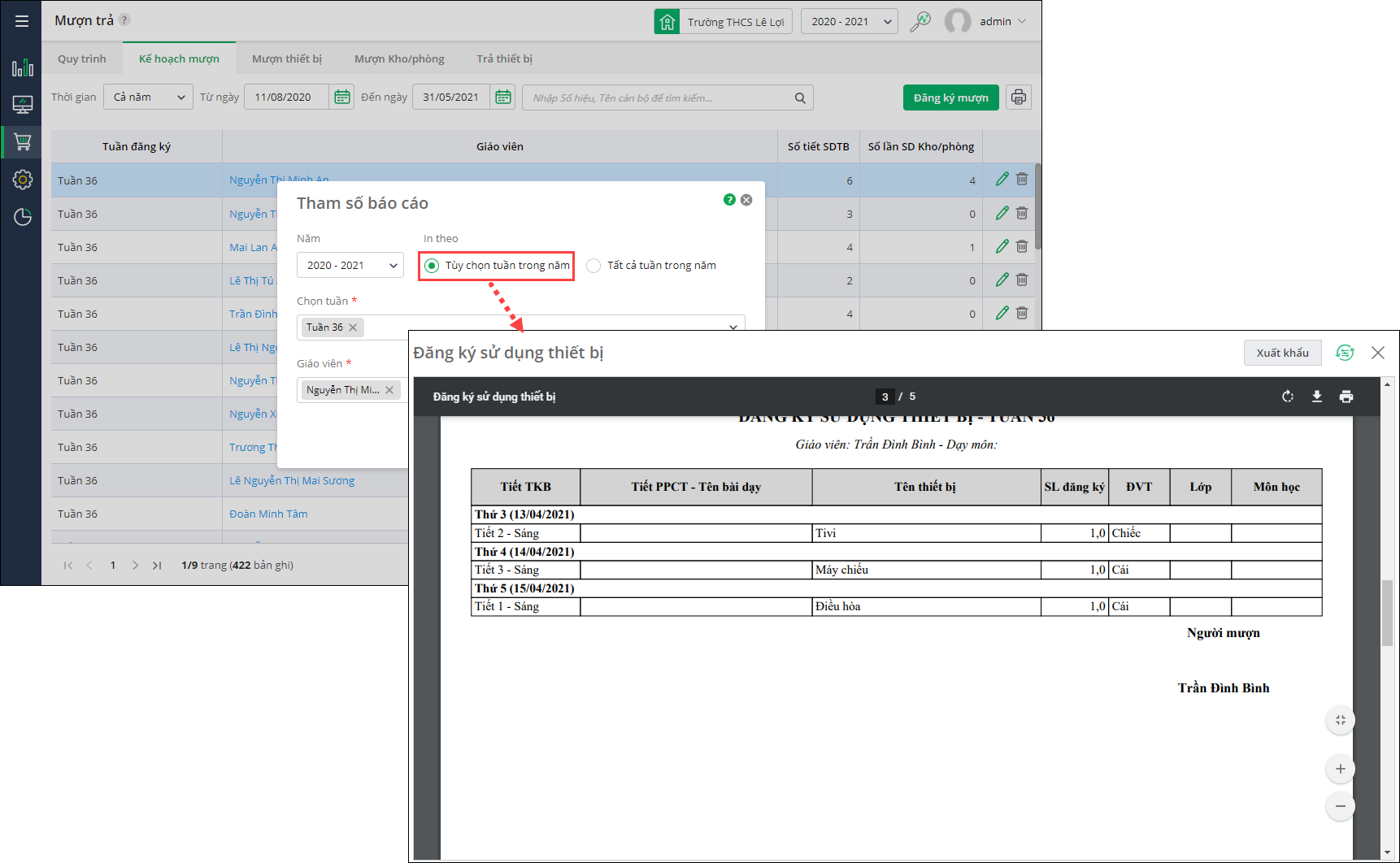 4. Nhấn vào tên giáo viên để hiển thị kế hoạch mượn thiết bị/kho phòng tương ứng.