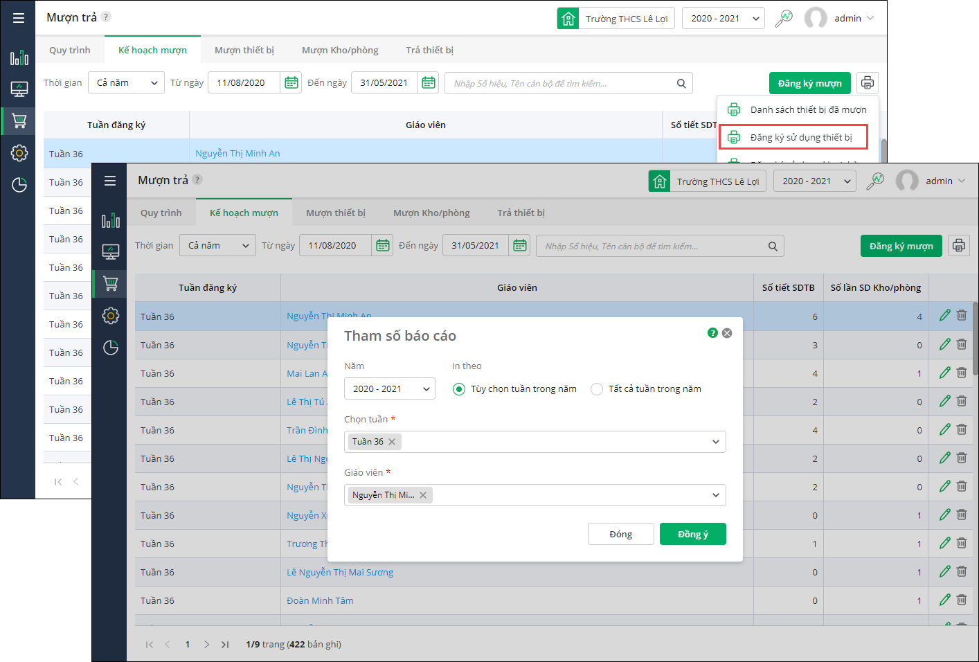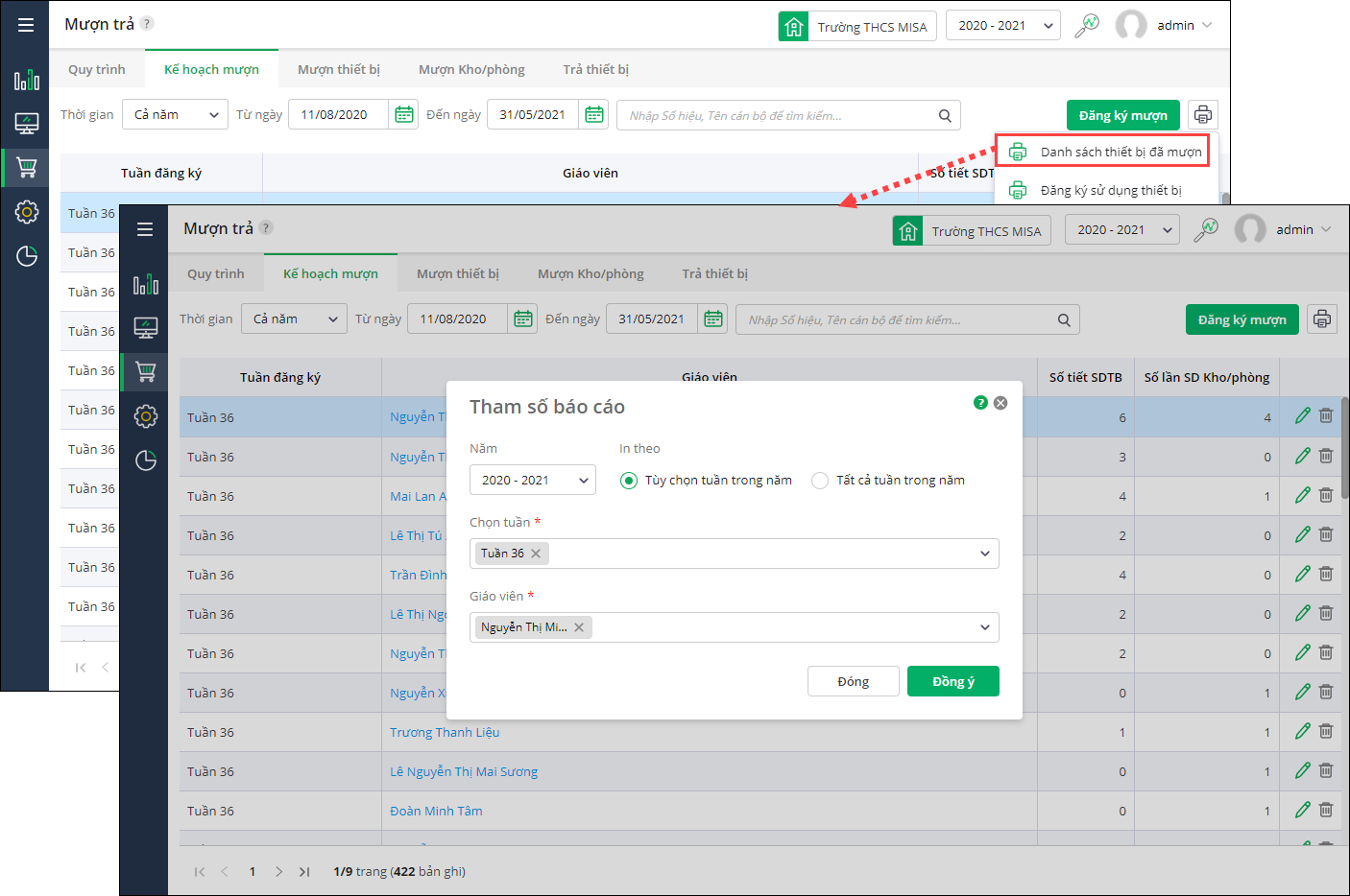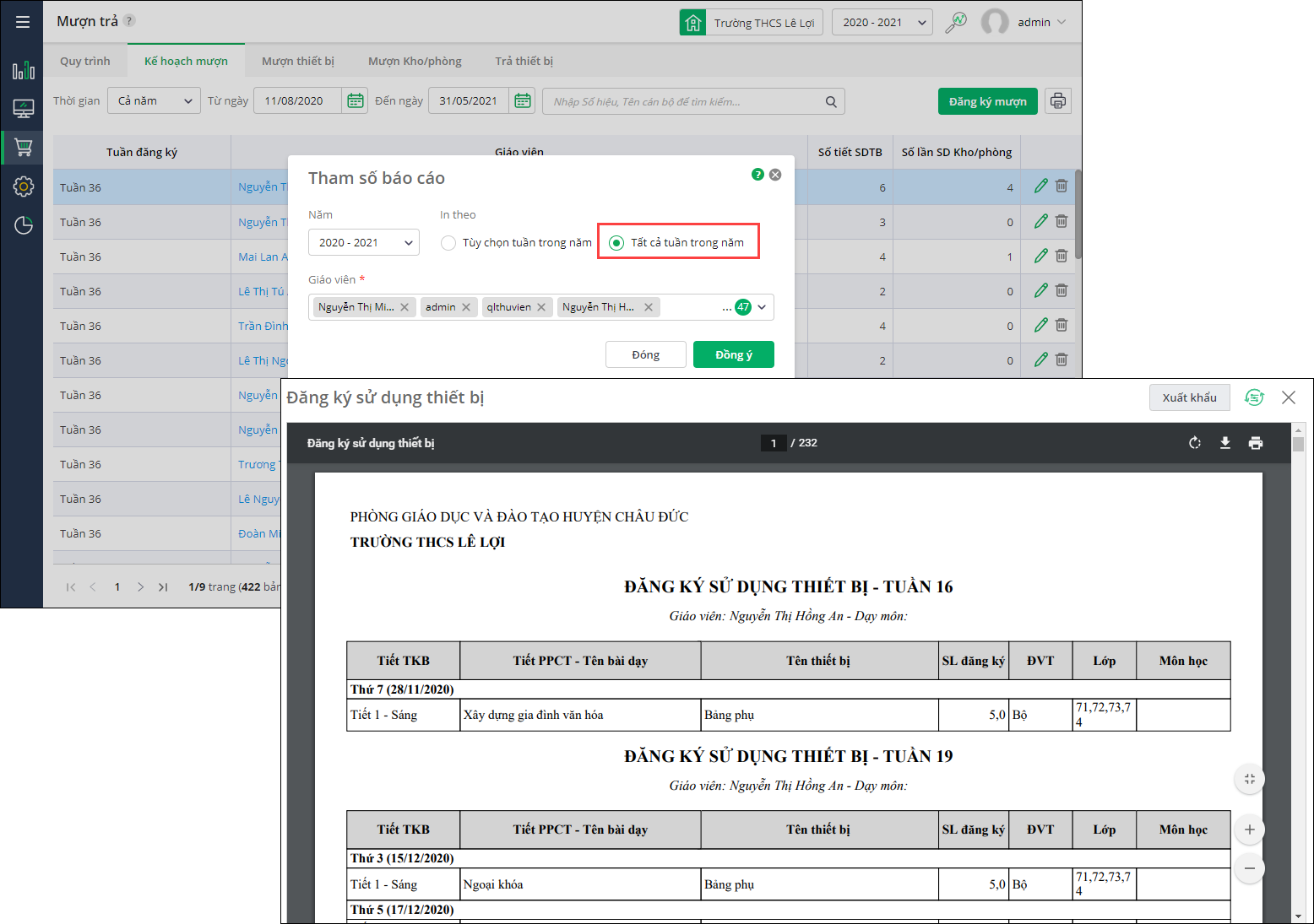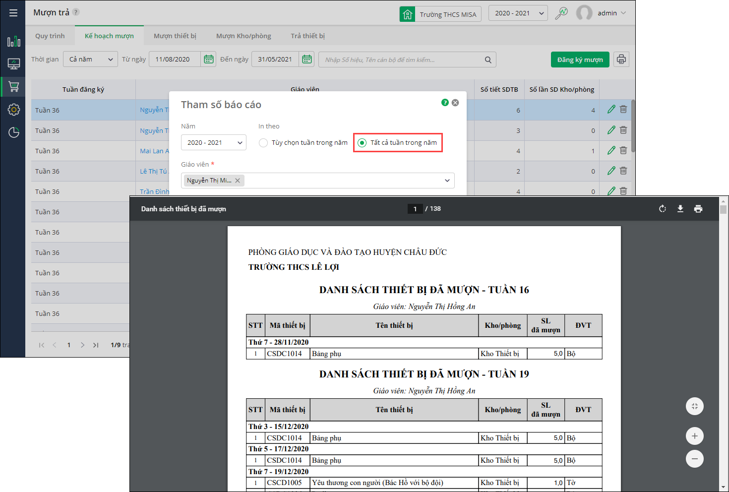 Giúp giáo viên quản lý thiết bị in danh sách đăng ký sử dụng thiết bị để lưu trữ thông tin đăng ký làm bằng chứng đối chiếu và kiểm tra theo yêu cầu của thanh tra.