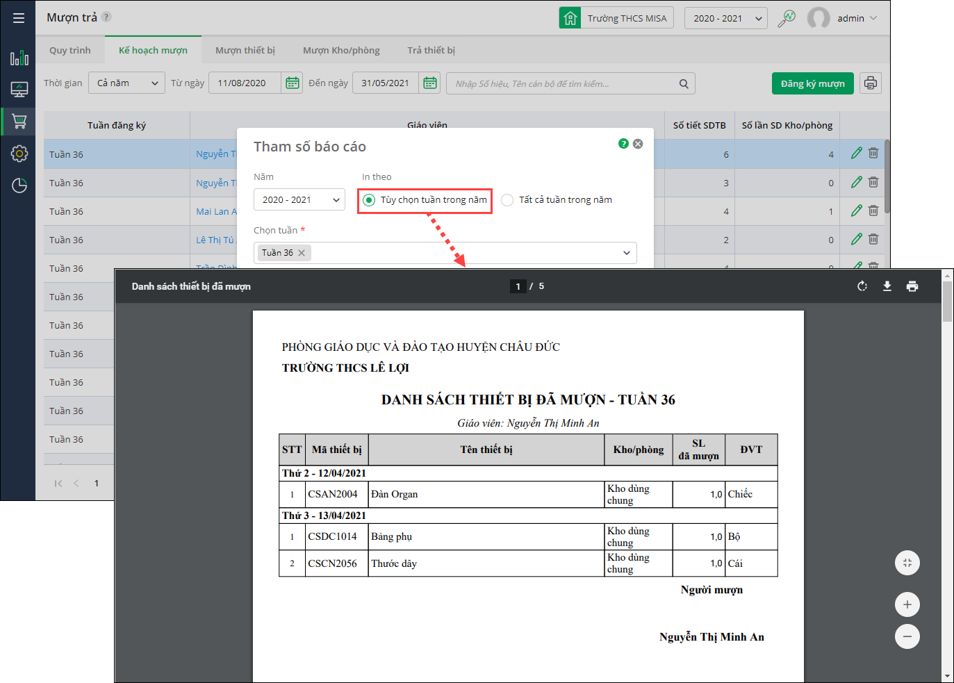 Giúp giáo viên quản lý thiêt bị in danh sách thiết bị đã mượn để đưa giáo viên ký xác nhận và lưu trữ theo quy định quản lý của nhà trường.