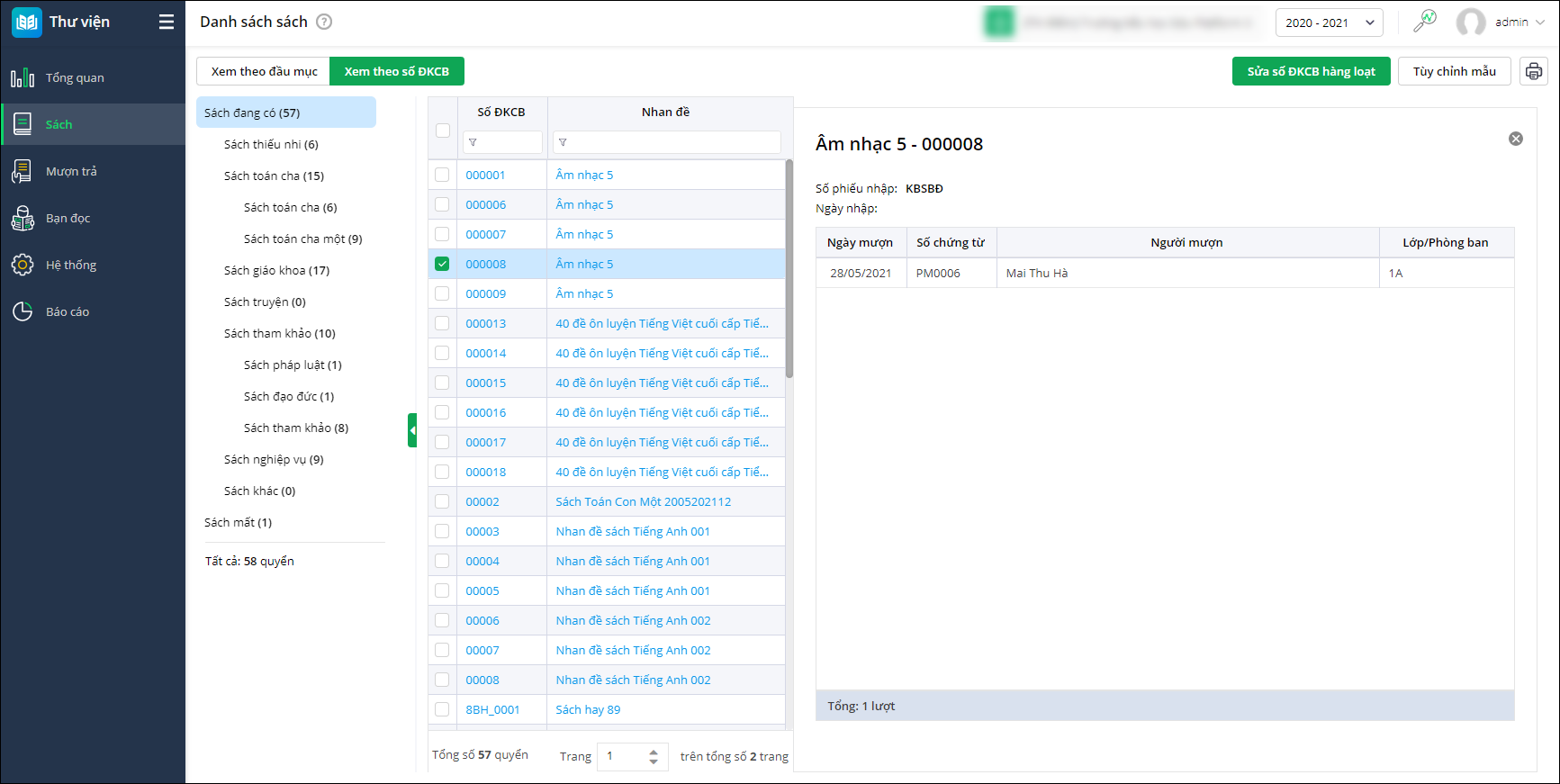 - Vào Sách\Danh sách sách. Chọn Xem theo số ĐKCB