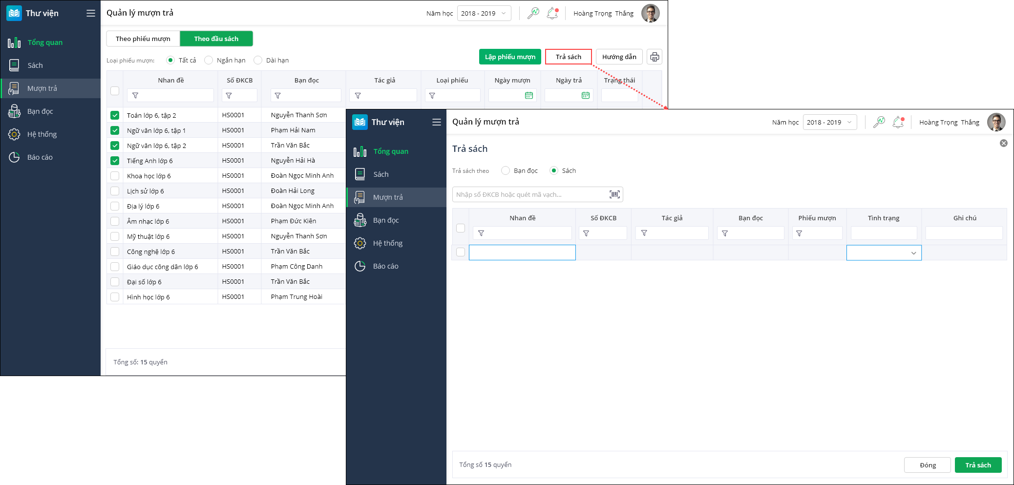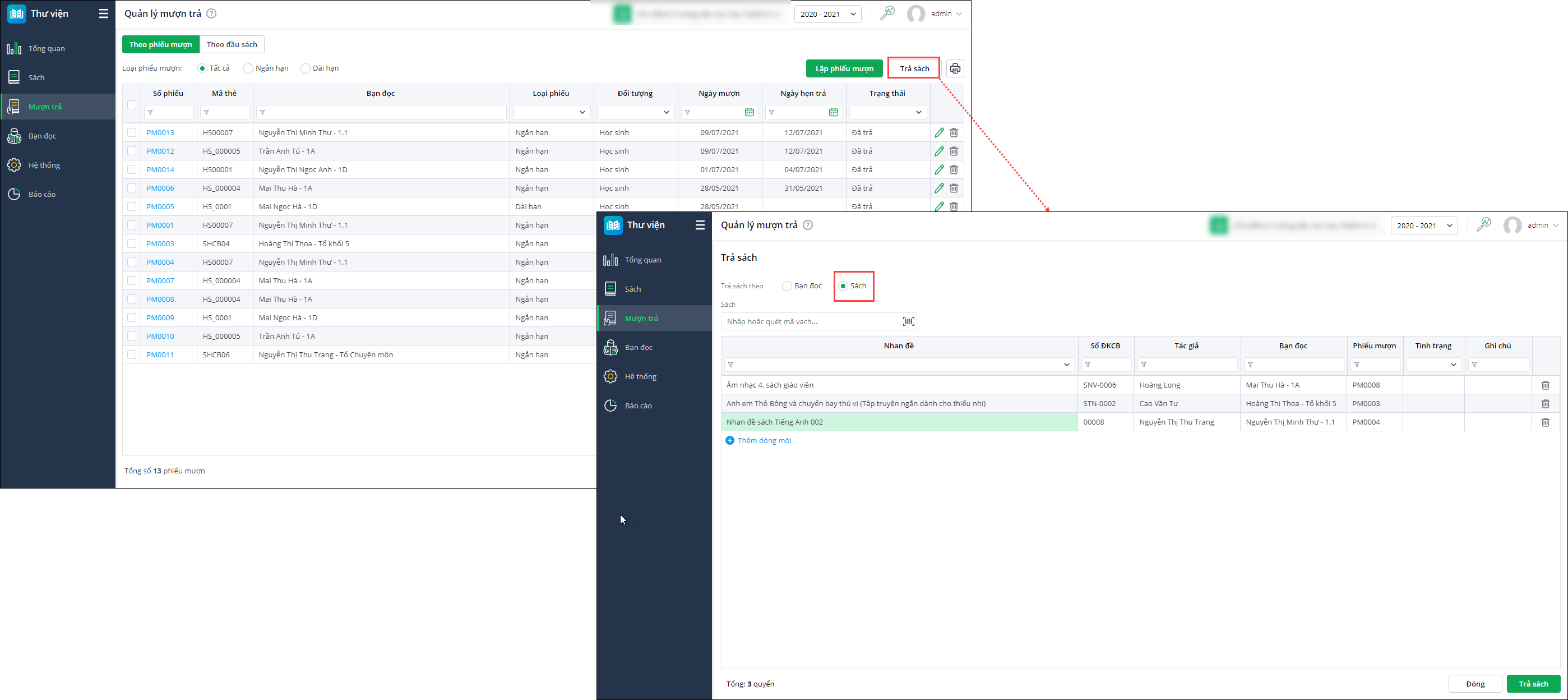 - Trả sách theo bạn đọc: Sử dụng số phiếu mượn của bạn đọc để trả sách
