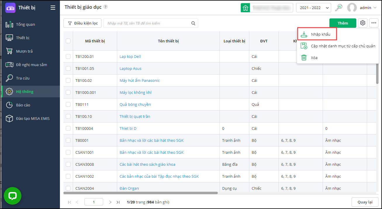 - Nhập khẩu mới/tải tệp mẫu rút gọn: Nhập khẩu nhanh thông tin cơ bản của học sinh: Tên thiết bị, Đơn vị tính.