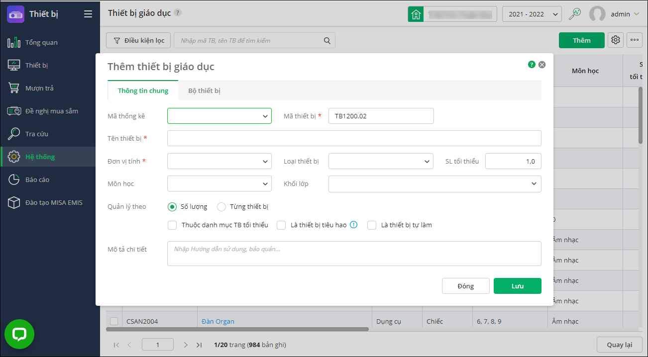- Mã thống kê: Là mã theo danh mục thiết bị dạy học tối thiểu của Bộ GD&ĐT/Sở GD&ĐT/Phòng GD&ĐT nếu trường có nhu cầu sử dụng mã thiết bị theo đơn vị chủ quản. Anh/chị tìm kiếm nhanh theo Tên thiết bị, Mã thống kê. Chọn thiết bị theo kết quả gợi ý. Phần mềm tự động lấy lên thông tin thiết bị đó theo Danh mục thiết bị tối thiểu theo quy định.