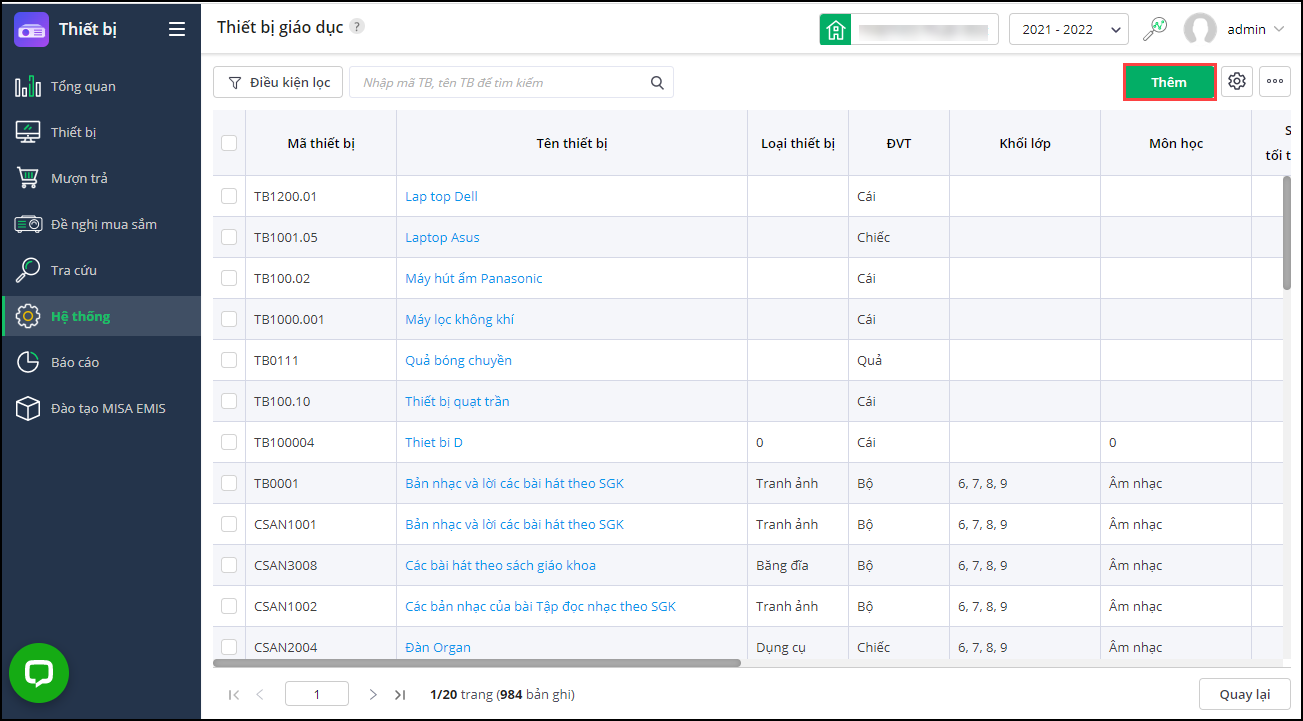 - Vào Hệ thống\Danh mục\Thiết bị giáo dục.