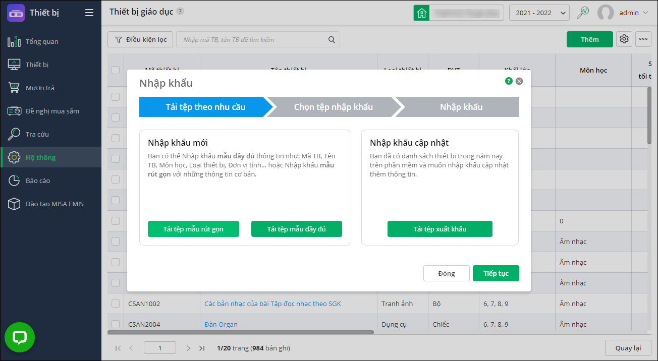 - Nhập khẩu mới/tải tệp mẫu rút gọn: Nhập khẩu nhanh thông tin cơ bản của học sinh: Tên thiết bị, Đơn vị tính.