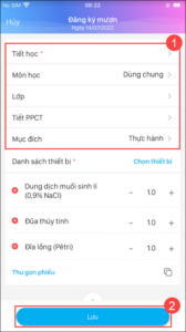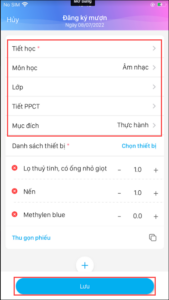 - Nhập các thông tin còn thiếu trên phiếu mượn: Tiết học, Lớp, Tiết PPCT,… Nhấn Lưu để lưu thông tin phiếu mượn.