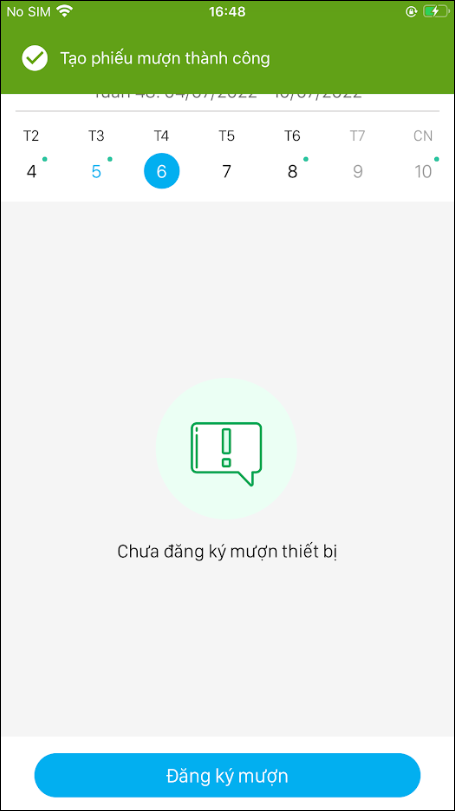 - Trường hợp anh/chị thực hiện sao chép sang tuần có phiếu mượn đã được ghi mượn: Ứng dụng hiển thị thông báo tuần đã phát sinh phiếu đăng ký được ghi mượn nên không thể sao chép đến ngày này.