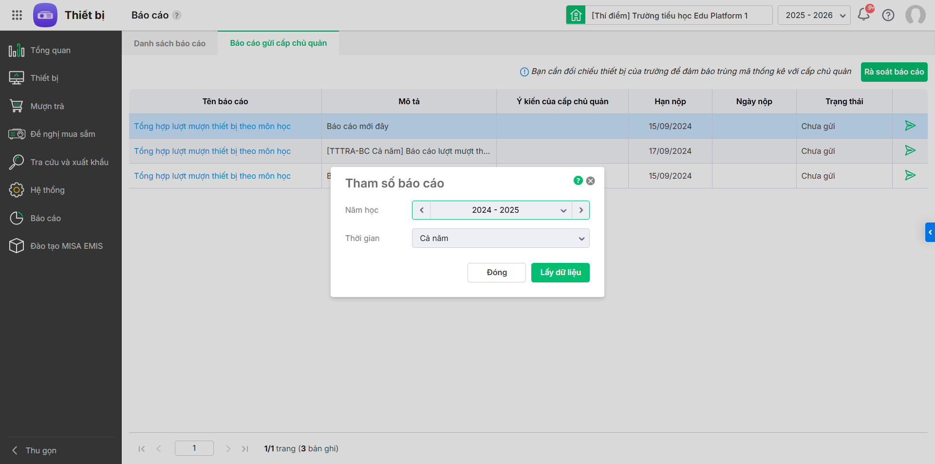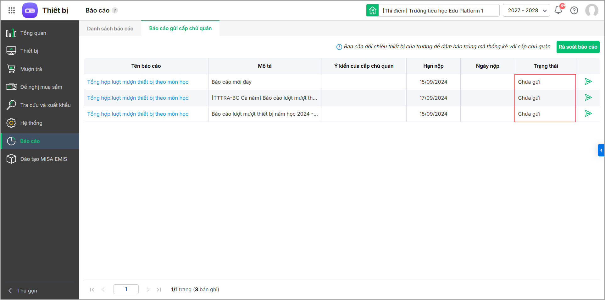 - Để đảm bảo thiết bị của trường trùng mã thống kê với cấp chủ quản, nhấn Rà soát báo cáo.
