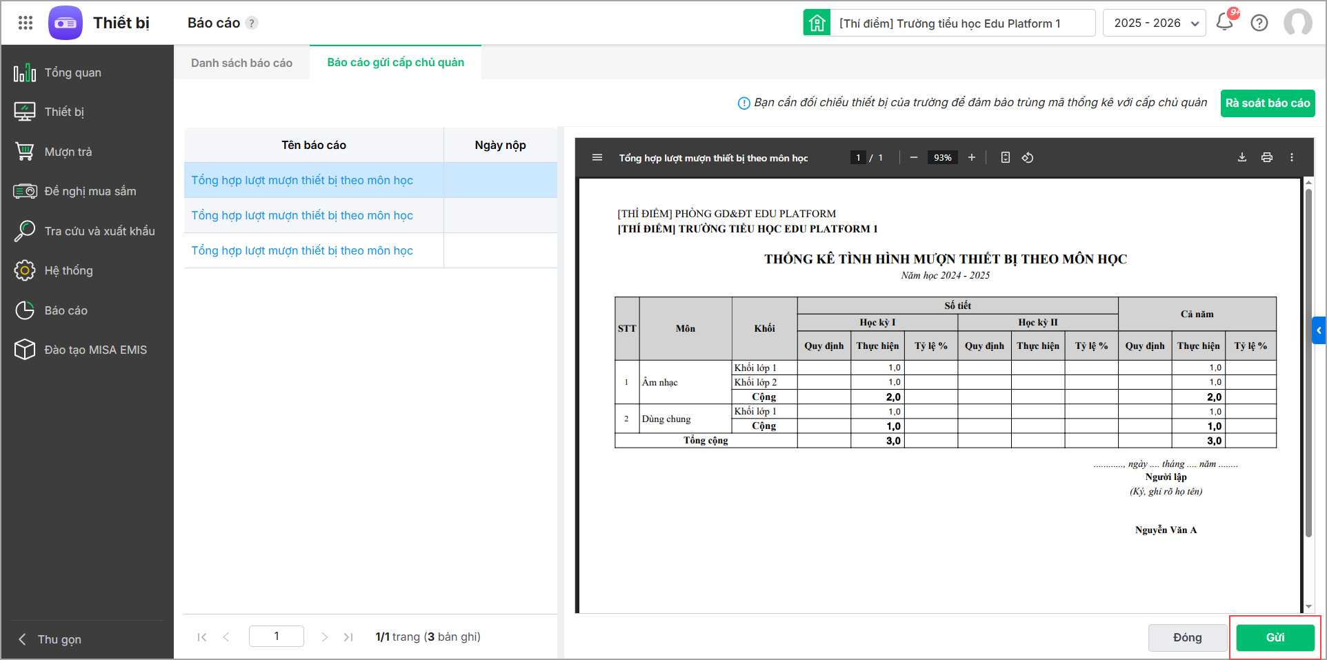 - Kiểm tra số liệu trên báo cáo. Nhấn Gửi để gửi báo cáo lên cấp chủ quản. Trạng thái báo cáo được hiển thị là Đã gửi.