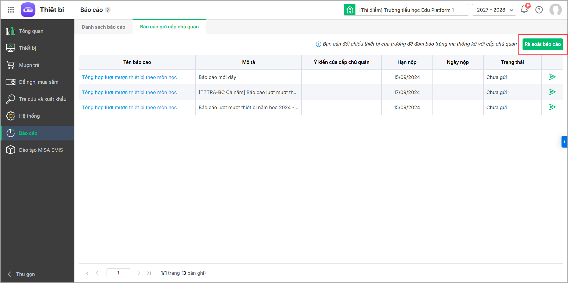 - Để đảm bảo thiết bị của trường trùng mã thống kê với cấp chủ quản, nhấn Rà soát báo cáo.