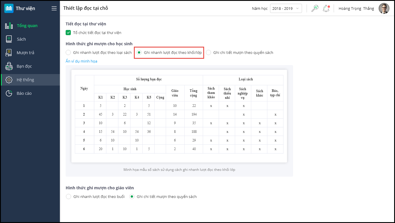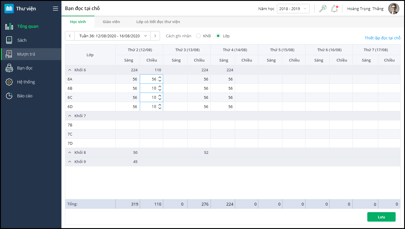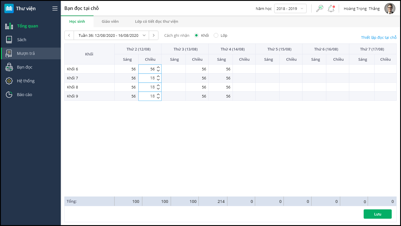 - Nhấn vào ô Khối/Lớp tương ứng với các buổi trong ngày để ghi nhận số lượt bạn đọc.