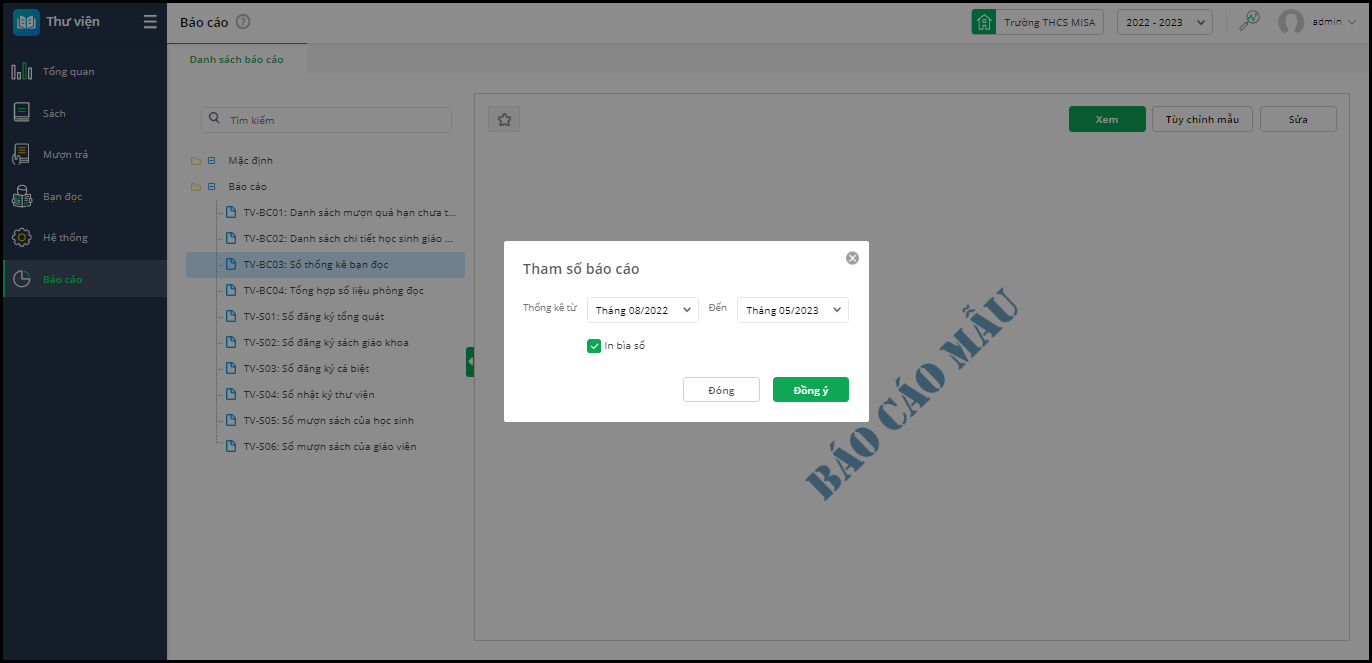 - Vào Thư viện/Báo cáo/TV-S03: Sổ thống kê bạn đọc