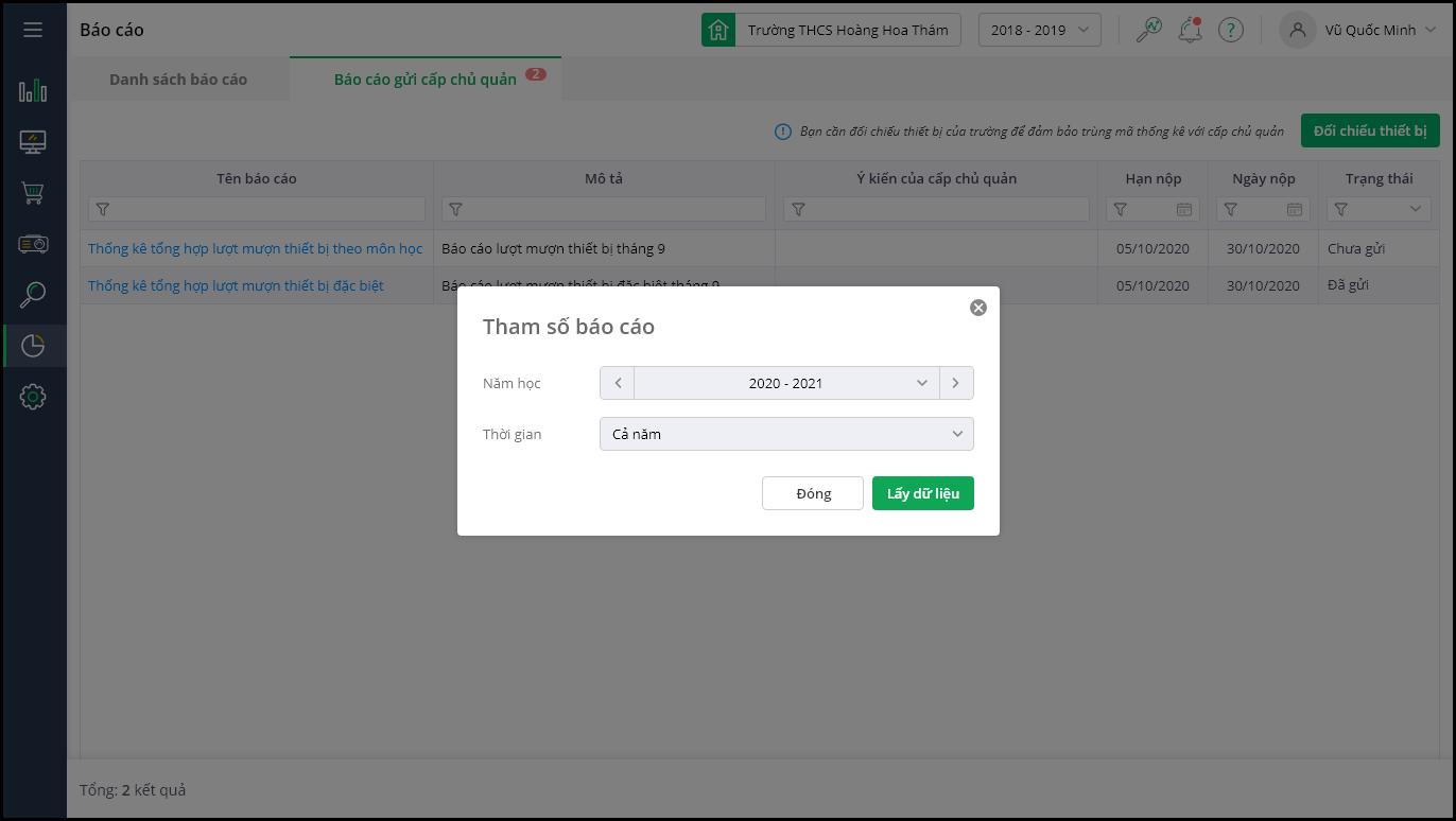 - Vào Thiết bị/Báo cáo, chọn báo cáo Thống kê lượt mượn thiết bị theo môn học