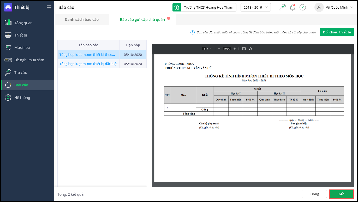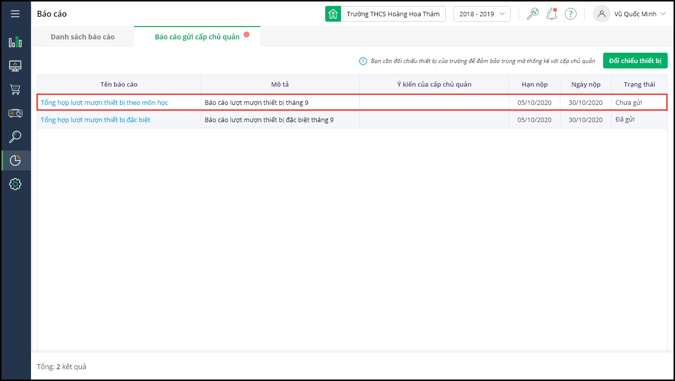 - Để đảm bảo thiết bị của trường trùng mã thống kê với cấp chủ quản, nhấn Rà soát báo cáo.
