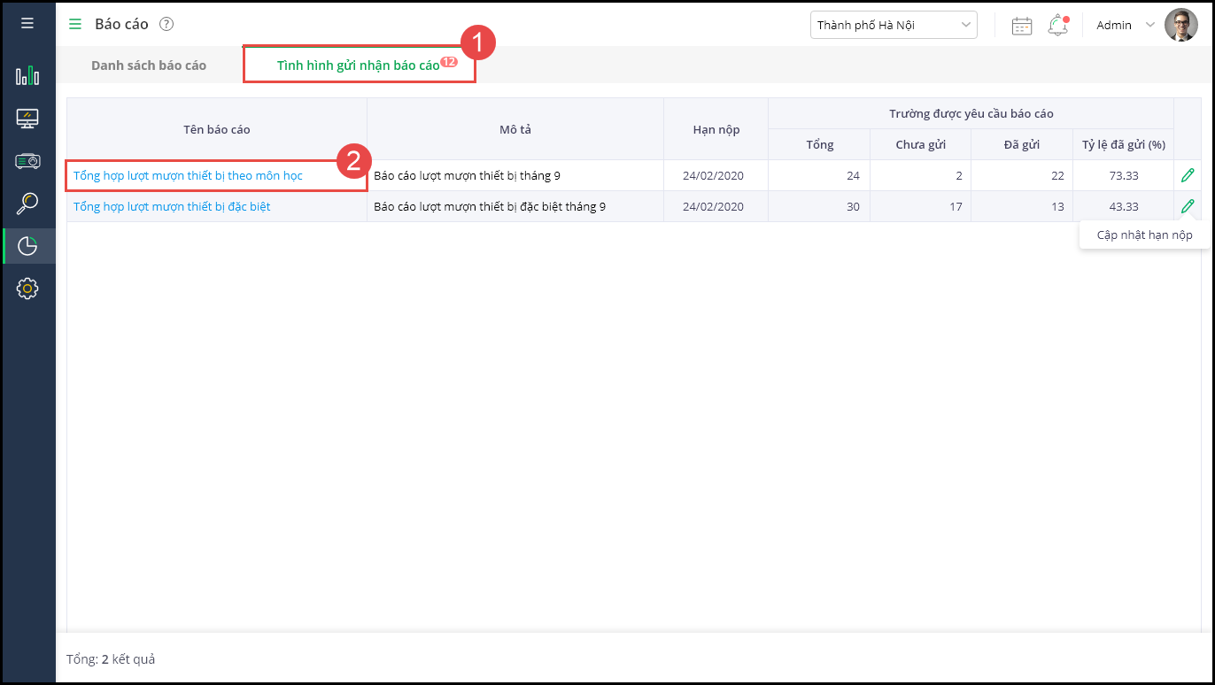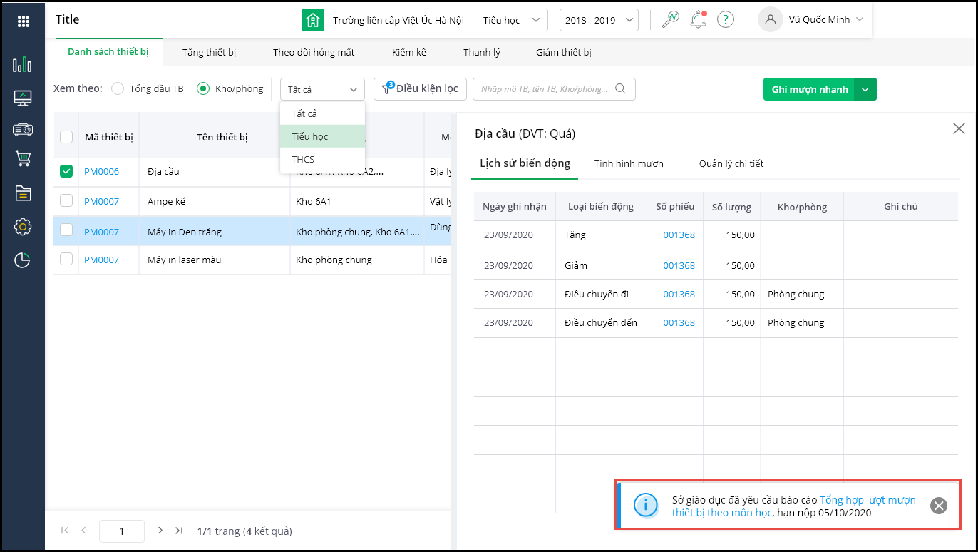 - Từ phiên bản R116: Chuyên viên SGD/PGD có thể gửi thông báo và tổng hợp báo cáo của các đơn vị trực thuộc dễ dàng để nắm được tình hình sử dụng thiết bị giáo dục theo từng môn học để báo cáo cấp trên nhằm có cơ sở đánh giá chất lượng giảng dạy tại các trường dựa trên số tiết sử dụng thiết bị sử dụng trong giảng dạy từng môn học trong chương trình.