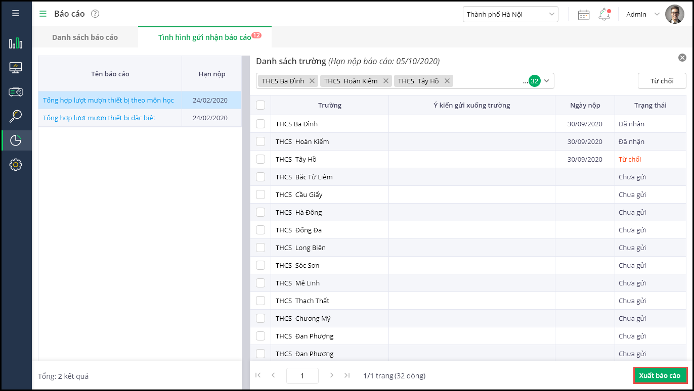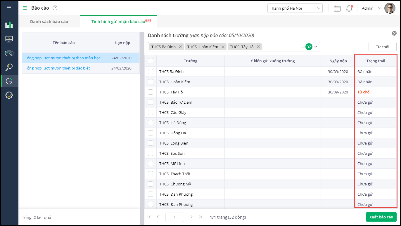 - Tại đây, tình hình gửi báo cáo của các trường được thể hiện với các trạng thái: Chưa gửi (trường chưa gửi báo cáo), Đã nhận (trường đã gửi báo cáo và hiển thị ngày gửi) hoặc Từ chối (Trường đã gửi báo cáo nhưng anh/chị từ chối do báo cáo không được duyệt và yêu cầu trường gửi lại).