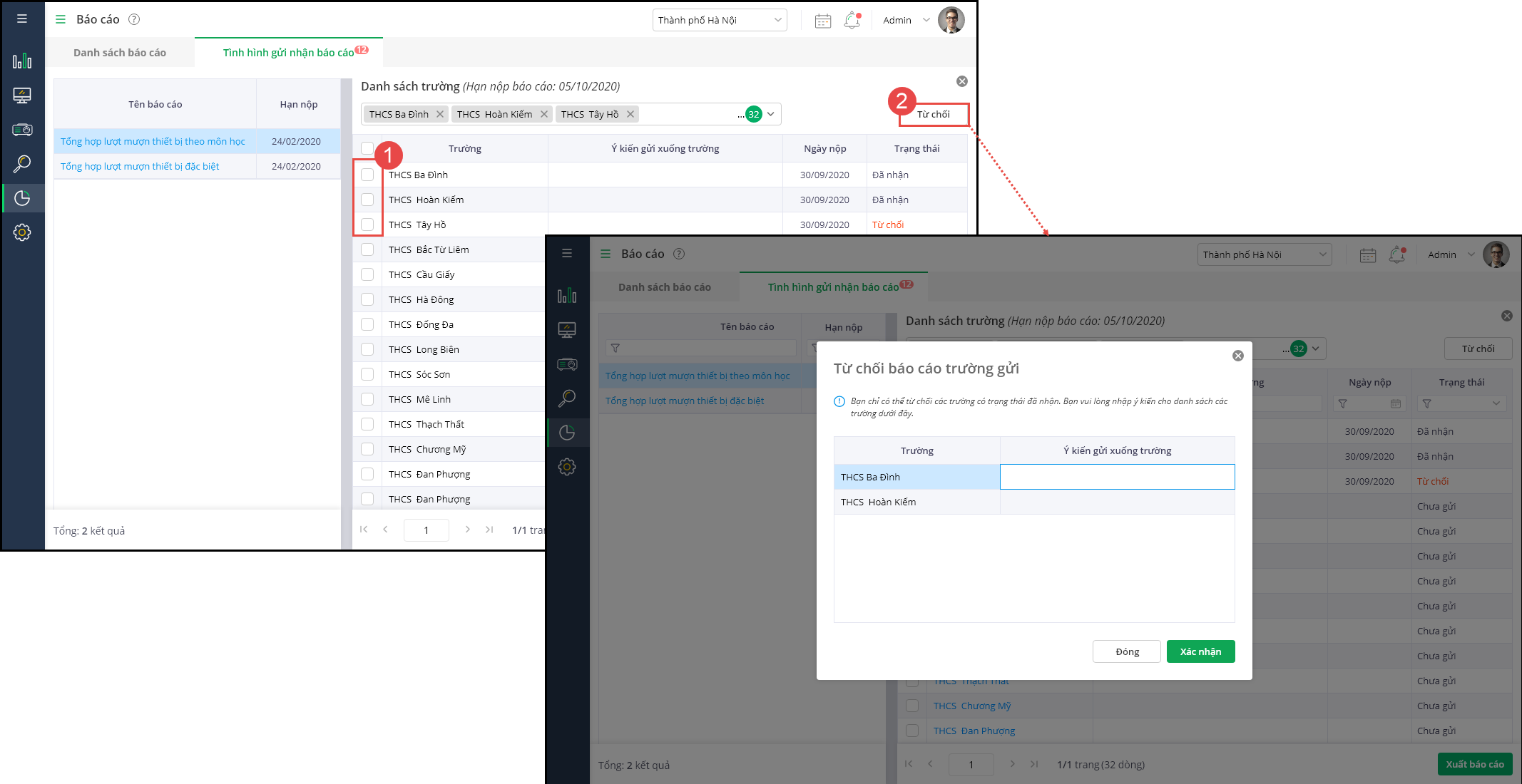 - Để từ chối báo cáo chưa đạt yêu cầu của trường đã gửi lên, anh chị tích chọn trường tương ứng, sau đó nhấn Từ chối và nhập ý kiến gửi xuống trường để trường nhận được thông tin và thực hiện chỉnh sửa, bổ sung theo yêu cầu.