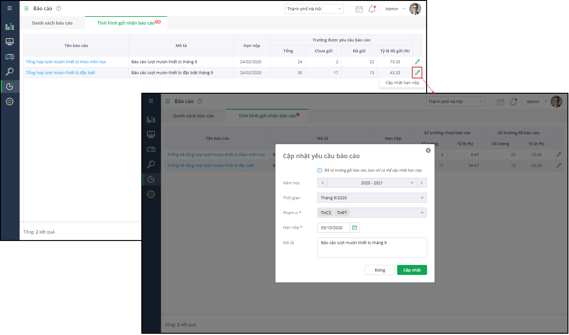 - Đối với các yêu cầu báo cáo đã được gửi, anh chị có thể cập nhật lại các yêu cầu này (thay đổi hạn nộp, thời gian, phạm vi) bằng cách nhấn Sửa và cập nhật lại các tham số báo cáo.