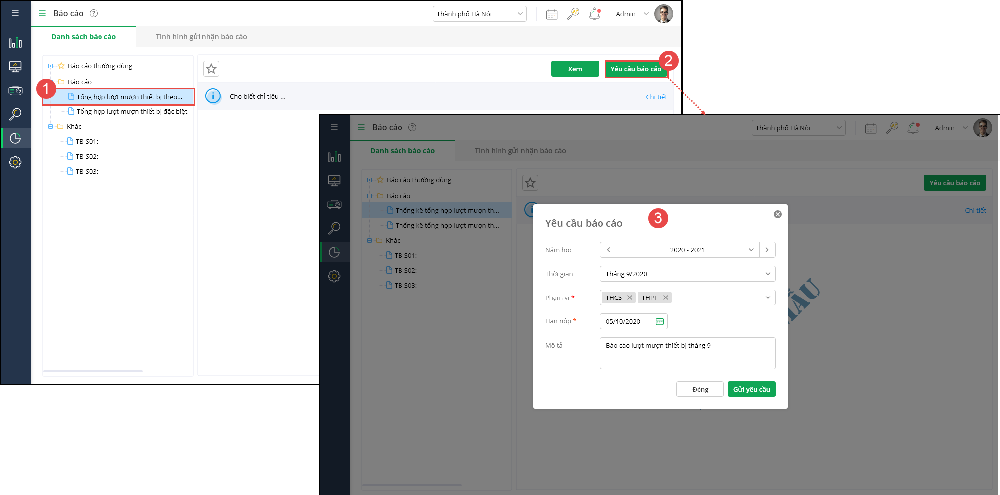 - Phạm vi: chọn các cấp đơn vị trực thuộc cần gửi báo cáo (Cấp Tiểu học,THCS, THPT, …)