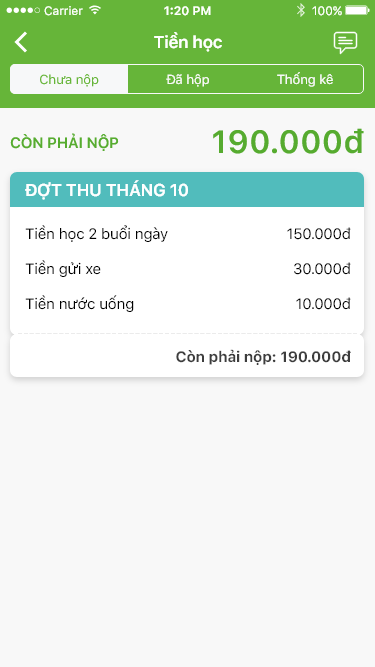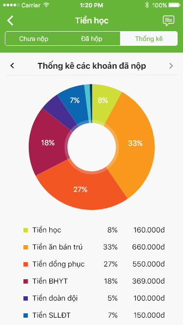 7. Chạm vào tab Thống kê để xem Thống kê về tình hình nộp phí hoặc Thống kê các khoản đã nộp của con.