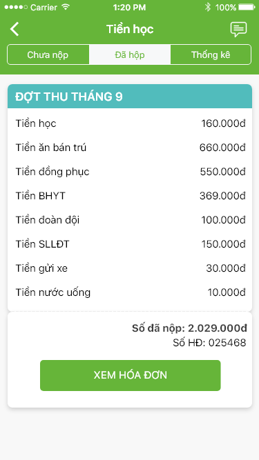 5. Chạm vào tab Đã nộp để xem các khoản đã nộp của con.