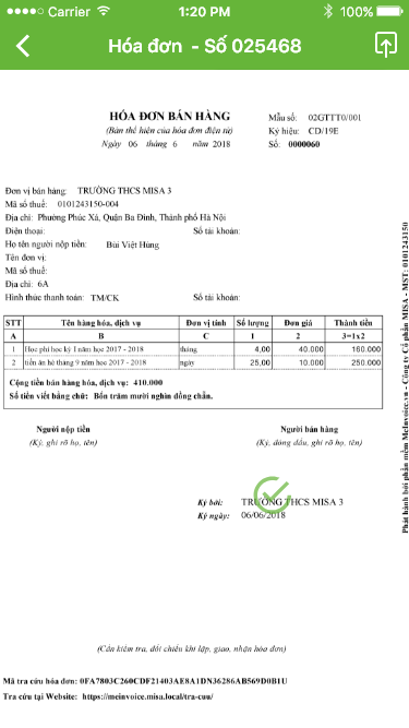 6. Trường hợp đơn vị có sử dụng hoá đơn điện tử thu tiền thì chạm vào Xem hoá đơn.