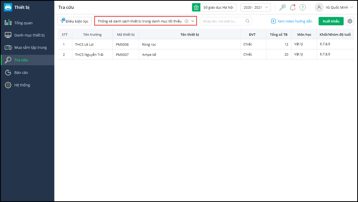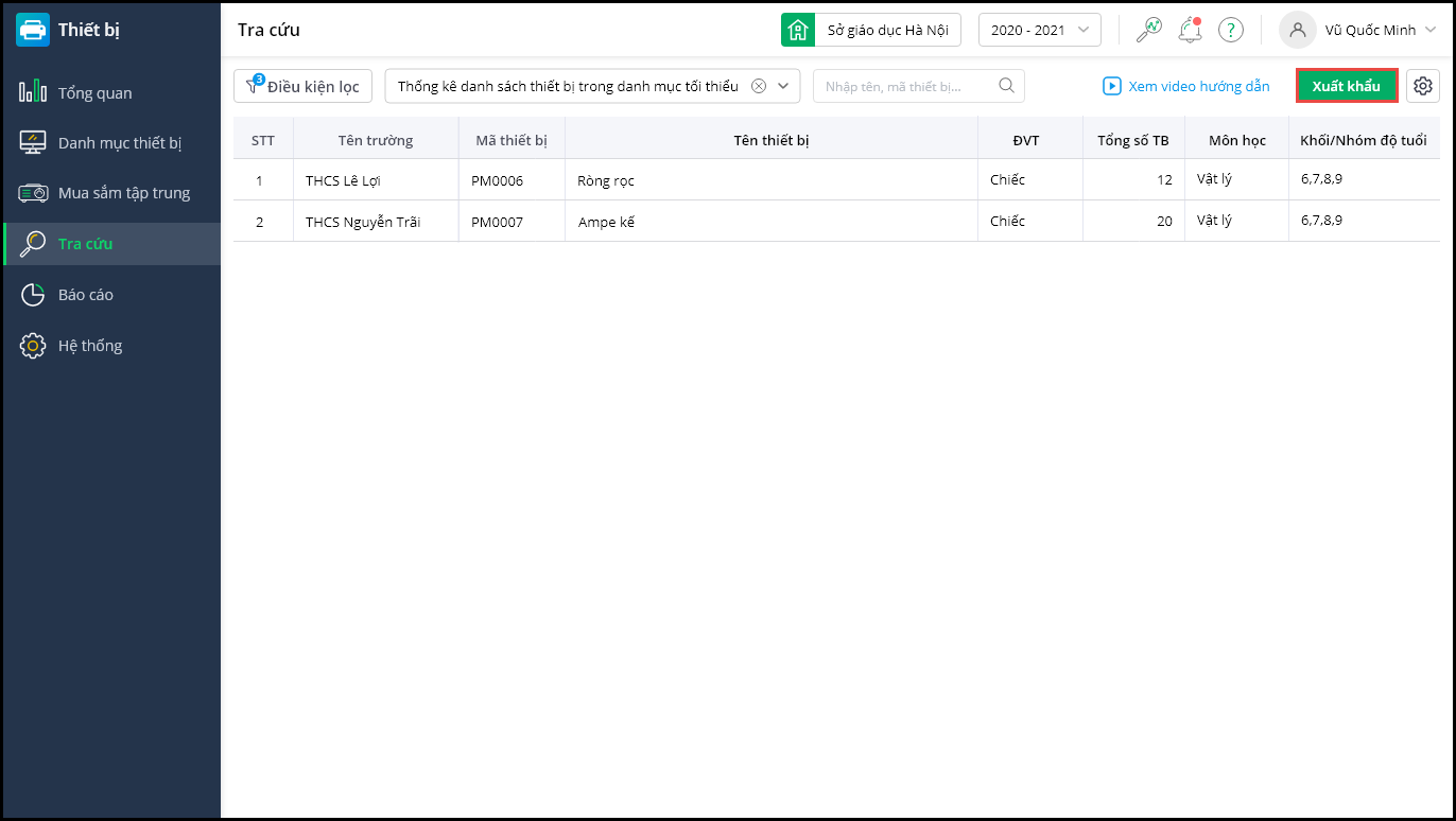 • Tại màn hình đang tra cứu, anh chị nhấn nút Xuất khẩu để xuất khẩu danh sách thiết bị ra file excel.