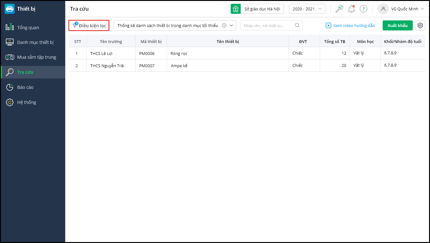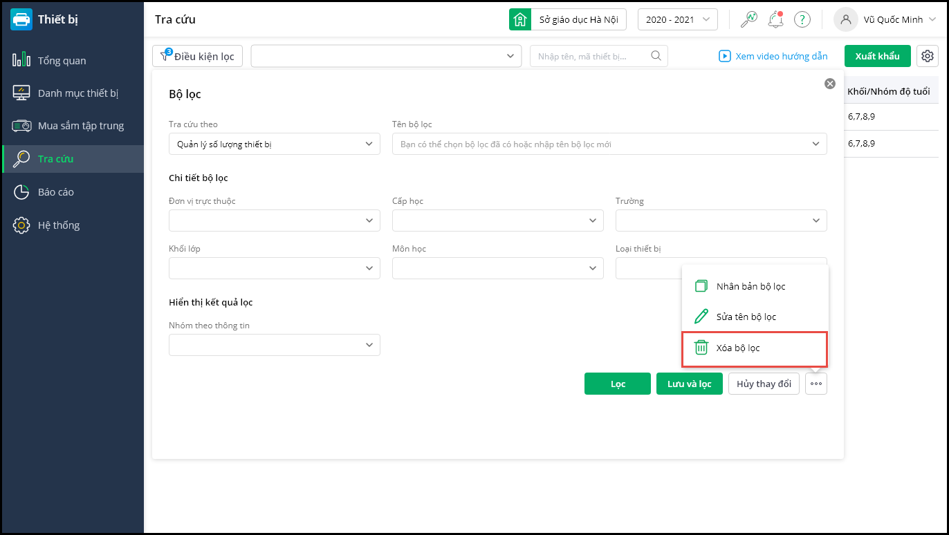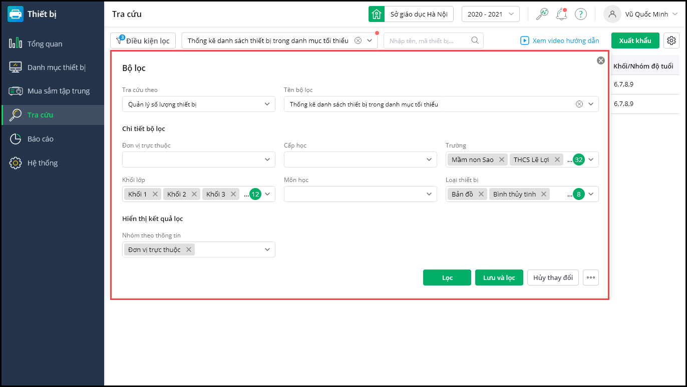 • Chi tiết bộ lọc: Chọn các giá trị lọc theo nhu cầu tra cứu theo nhu cầu: Đơn vị trực thuộc, Cấp học, Trường, Khối lớp, Môn học, Loại thiết bị.