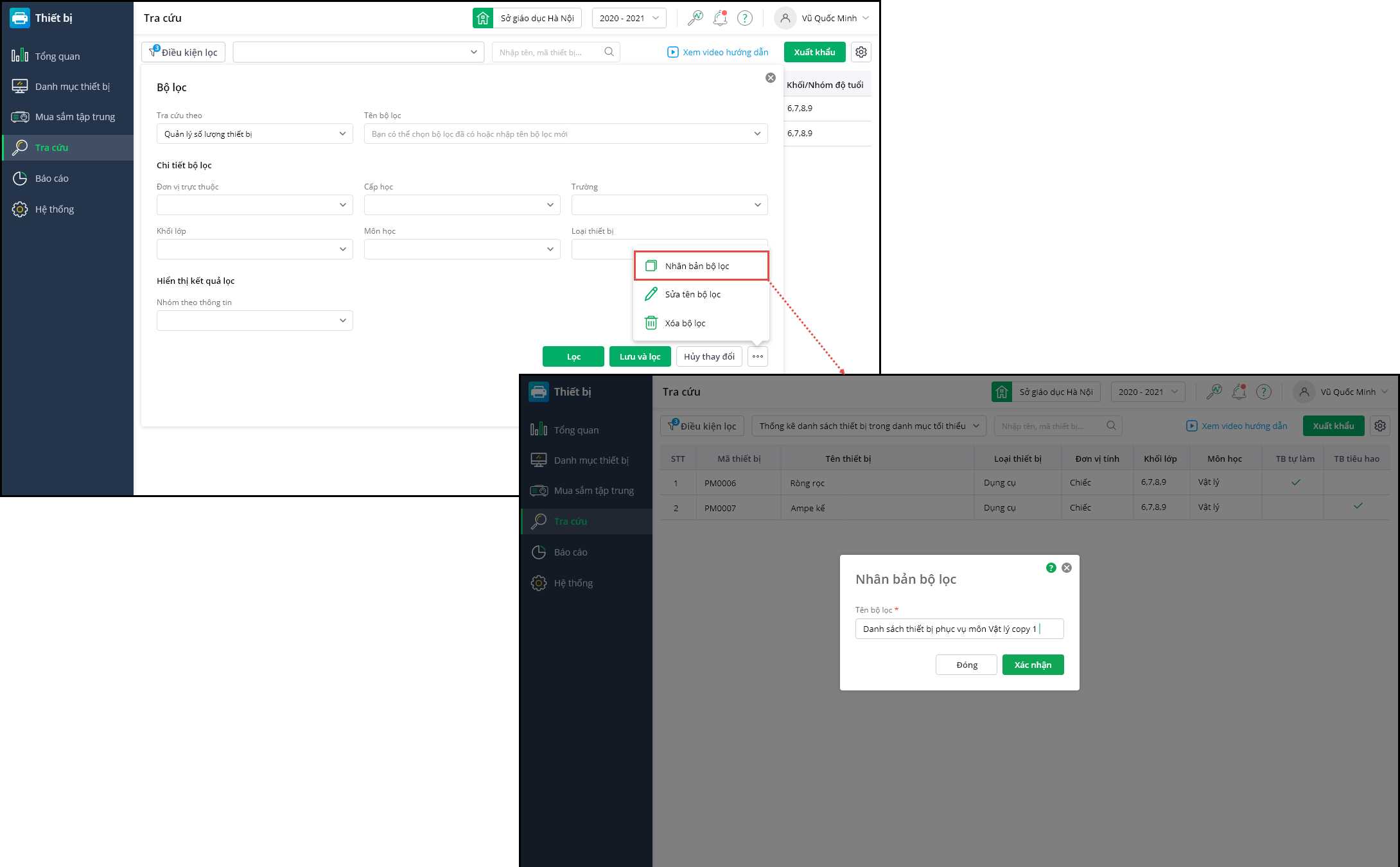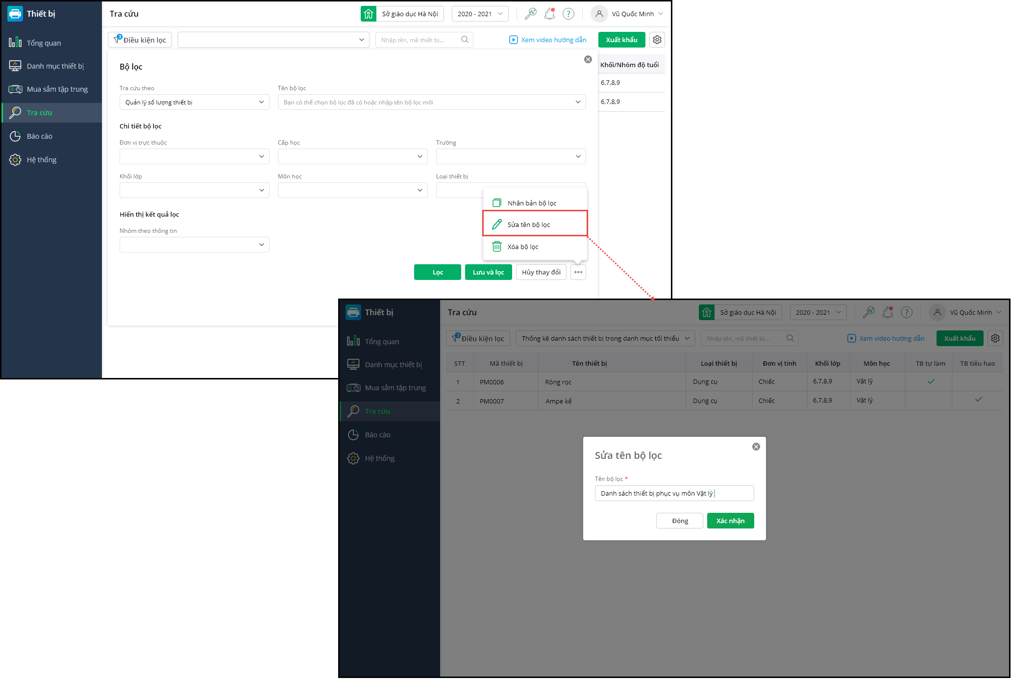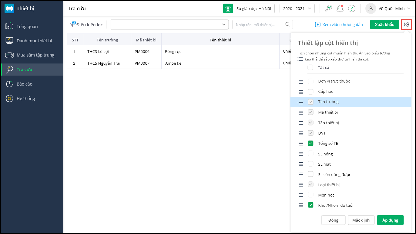 • Chi tiết bộ lọc: Chọn các giá trị lọc theo nhu cầu tra cứu theo nhu cầu: Đơn vị trực thuộc, Cấp học, Trường, Khối lớp, Môn học, Loại thiết bị.