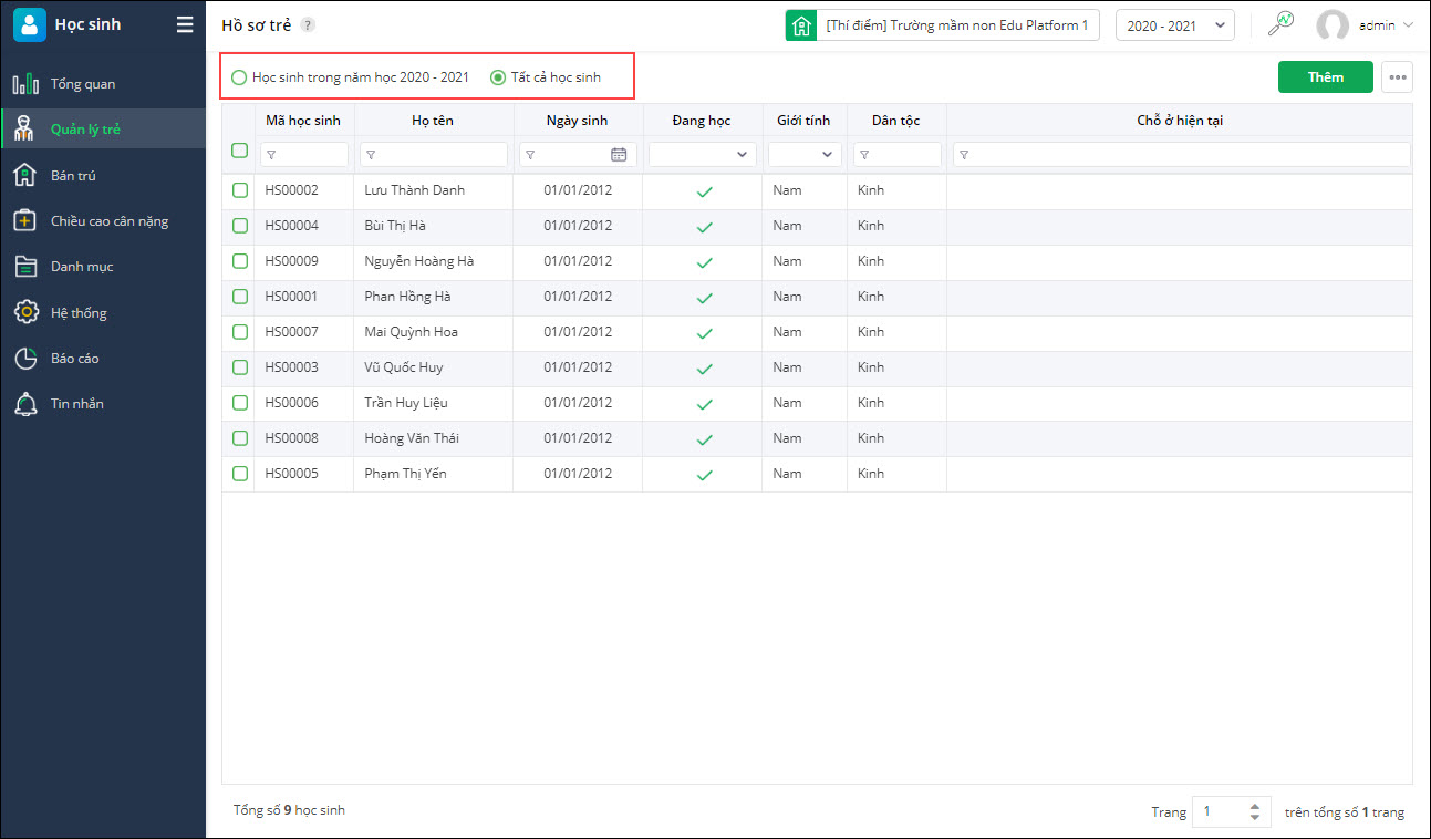 - Tại phân hệ Học sinh\Quản lý trẻ\Hồ sơ trẻ. Tại đây anh/chị có thể theo dõi hồ sơ tất cả học sinh đã nhập trên phần mềm (theo các năm) hoặc danh sách học sinh đang theo học tại trường (năm học hiện tại)