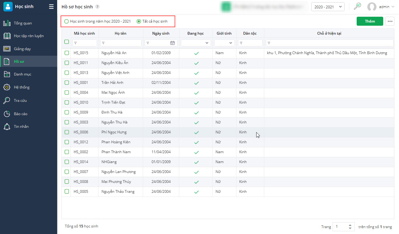 - Tại phân hệ Học sinh\Hồ sơ\Hồ sơ học sinh. Tại đây anh/chị có thể theo dõi hồ sơ tất cả học sinh đã nhập trên phần mềm (theo các năm) hoặc danh sách học sinh đang theo học tại trường (năm học hiện tại).