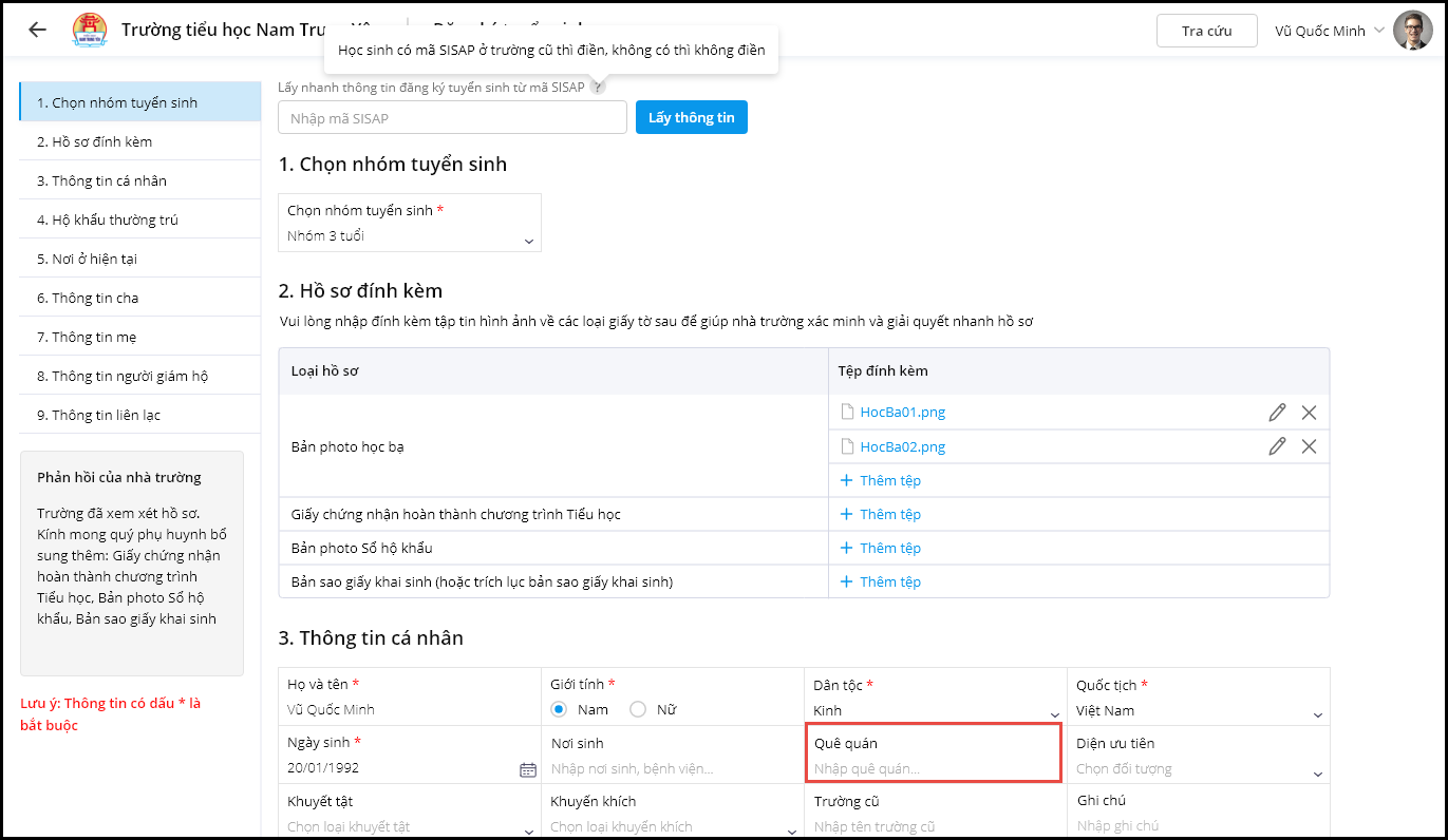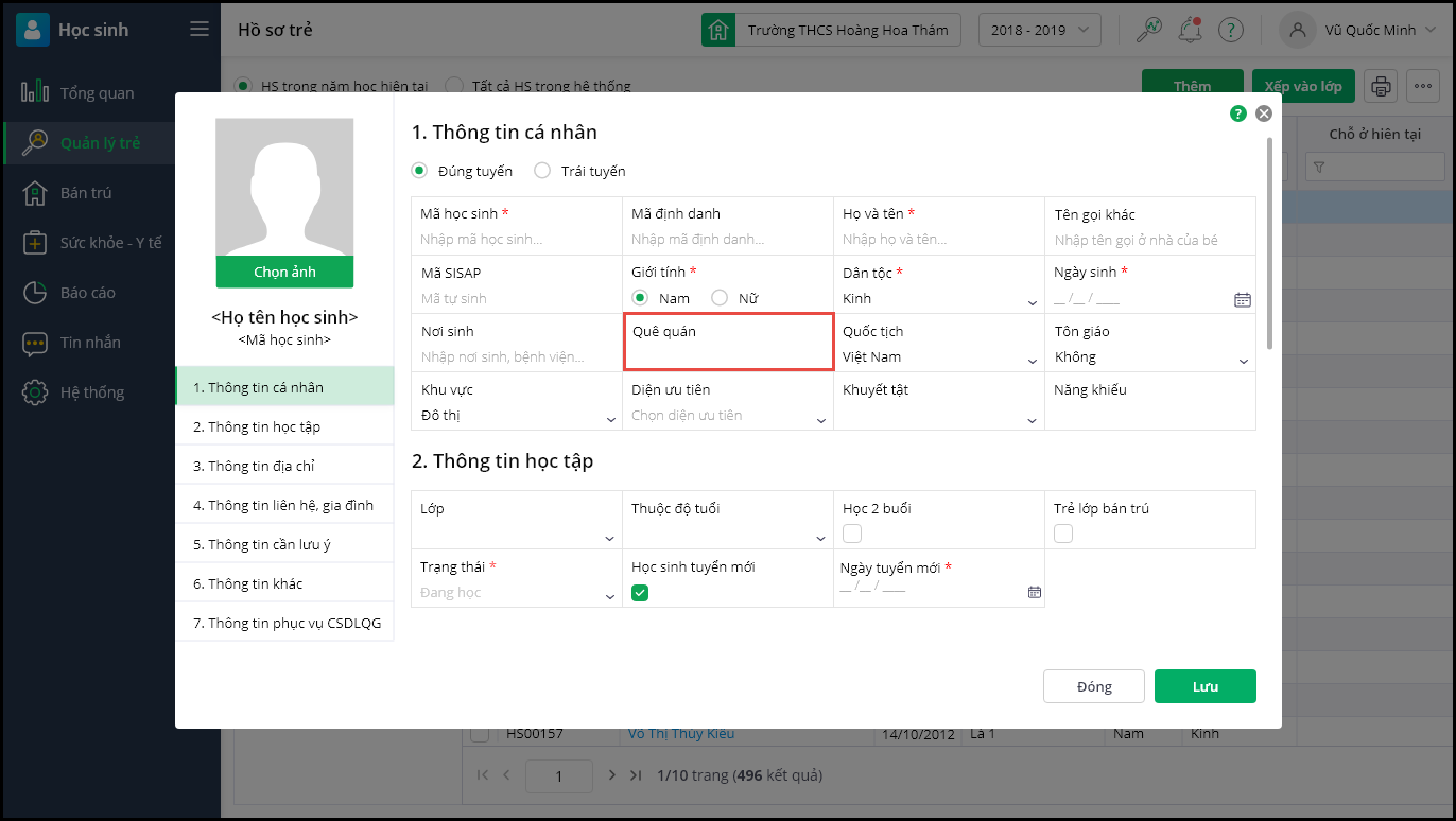 - Từ phiên bản R116: Giáo viên có thể bổ sung quê quán trên hồ sơ học sinh, làm căn cứ để in thông tin trên học bạ chính xác.
