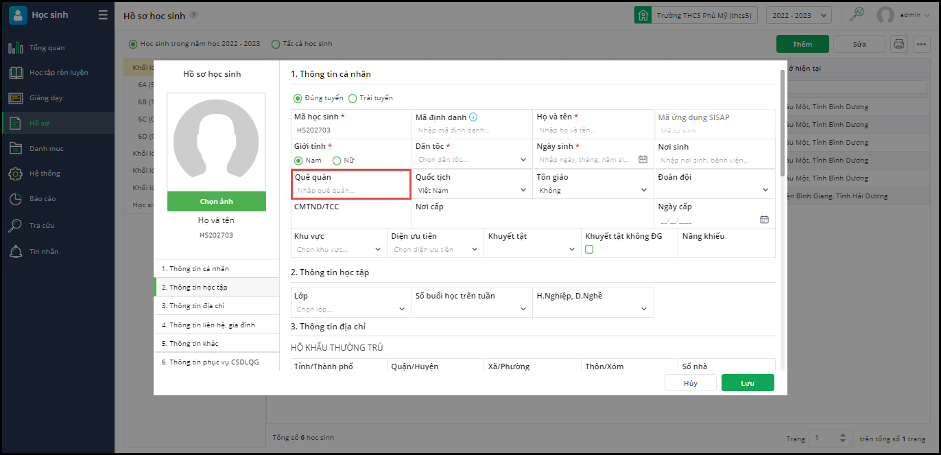 - Nhấn Thêm để khai báo thông tin hồ sơ học: Thông tin cá nhân, Thông tin địa chỉ, Quê quán, Thông tin liên hệ hay Thông tin khác. Thông tin quê quán được bổ sung tại đây.