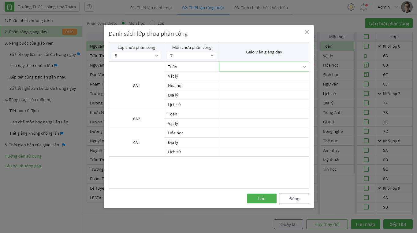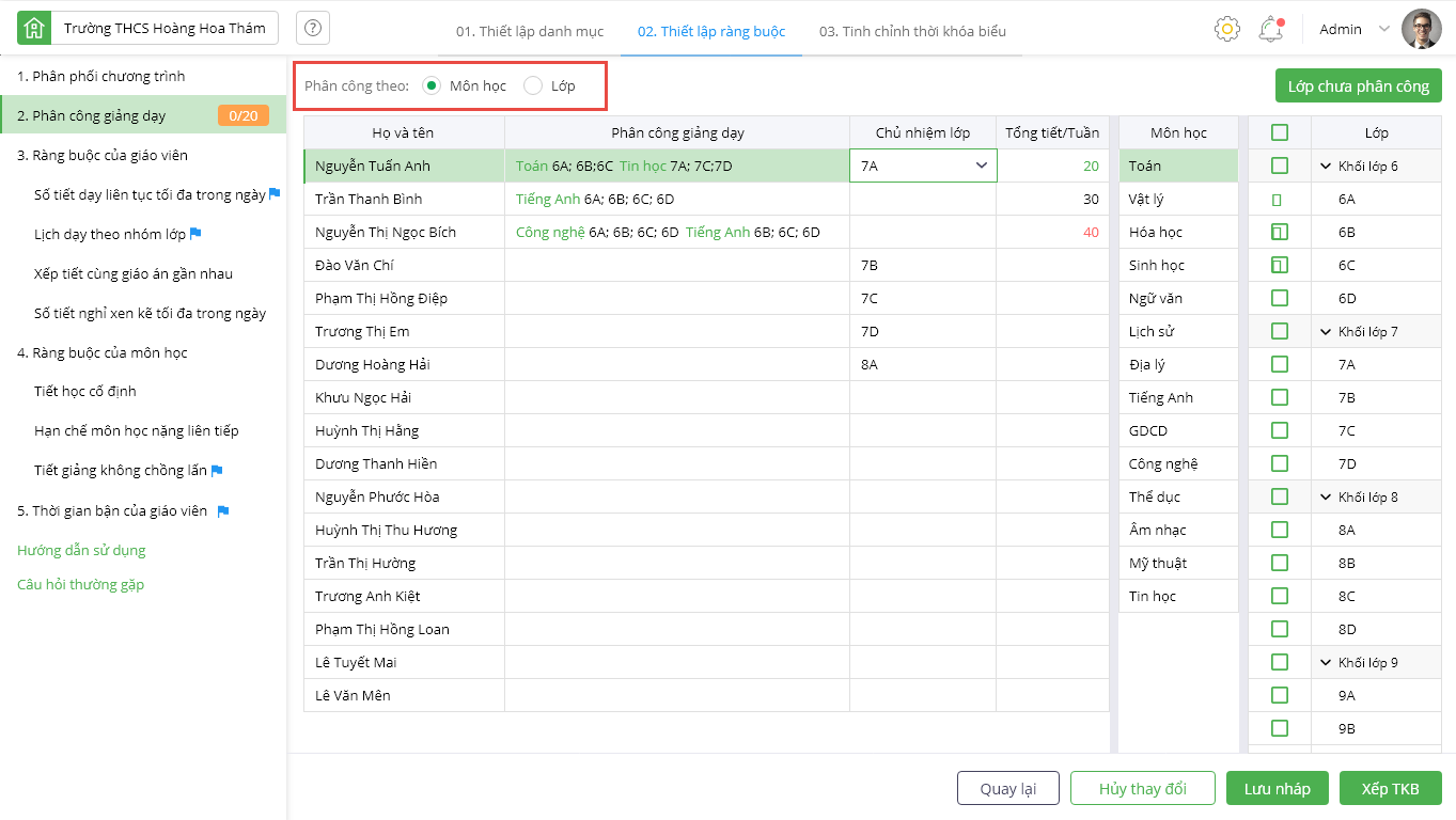 Tại bước Thiết lập ràng buộc, anh chị chọn Phân công giảng dạy. Tại đây, anh/chị thực hiện khai báo phân công giảng dạy cho các giáo viên trong trường. Thực hiện phân công theo Lớp hoặc theo Môn học.
