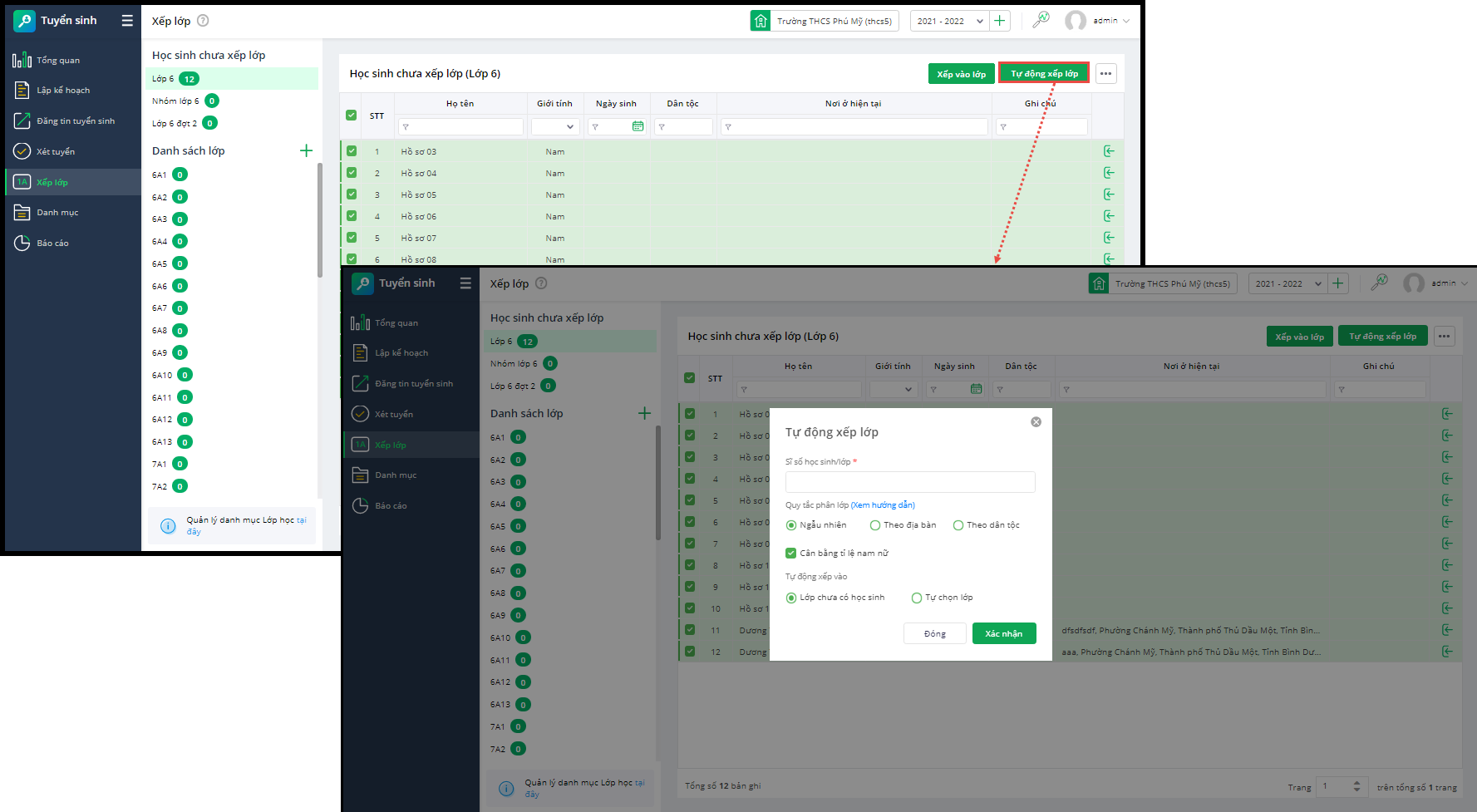 – Tự chọn lớp: Phần mềm xếp lớp cho các học sinh vào các lớp đã chọn - Nhấn Xác nhận.