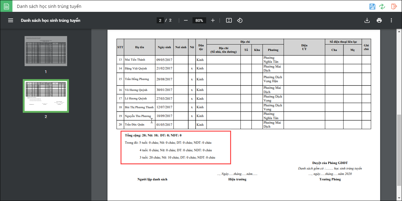 - Vào Tuyển sinh\Báo cáo\Danh sách trúng tuyển