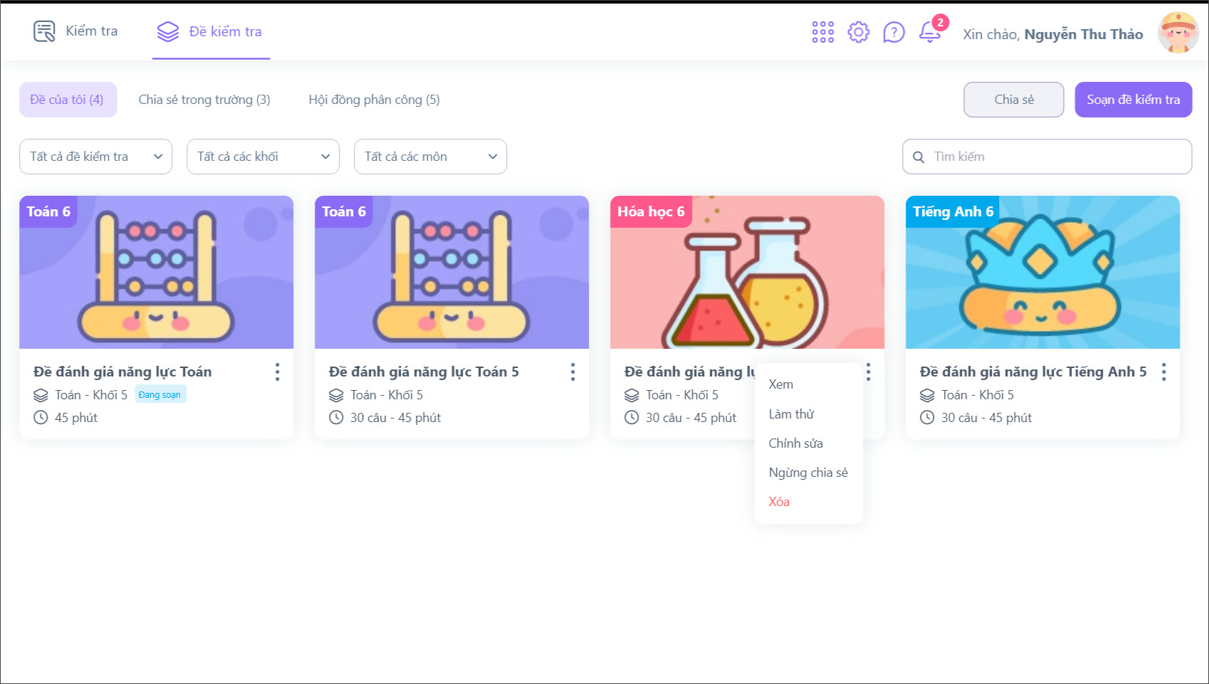 - Giáo viên vào Đề kiểm tra, chọn đề kiểm tra muốn chia sẻ và nhấn Chia sẻ.