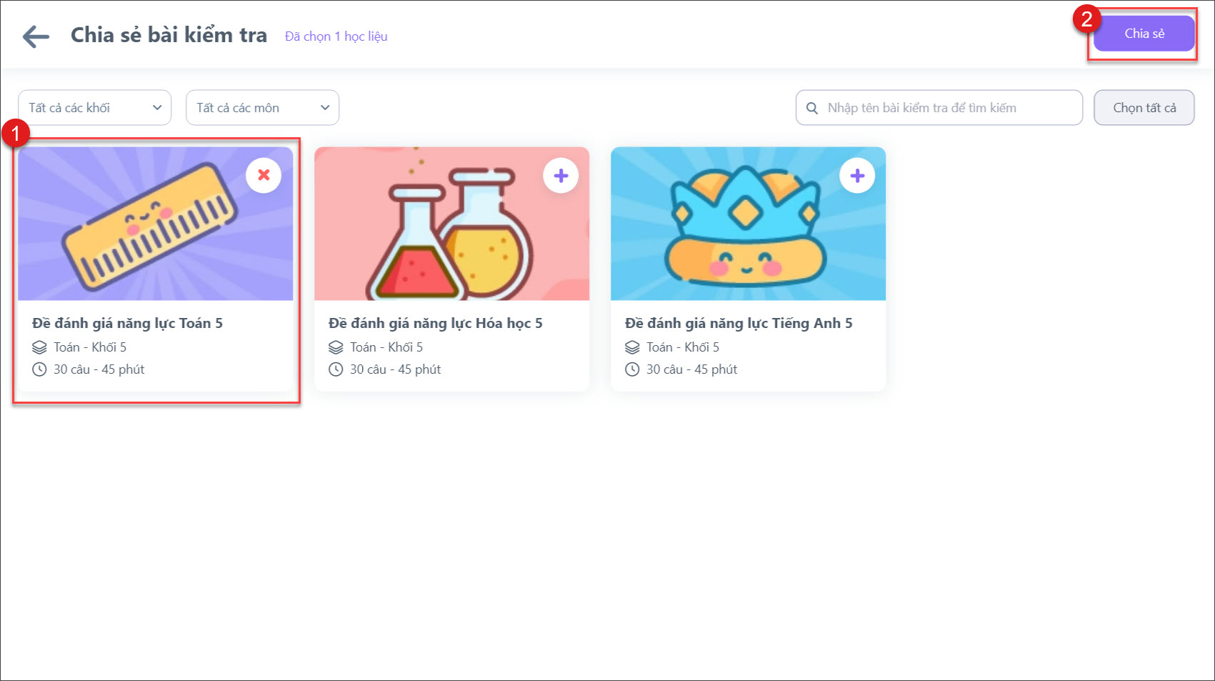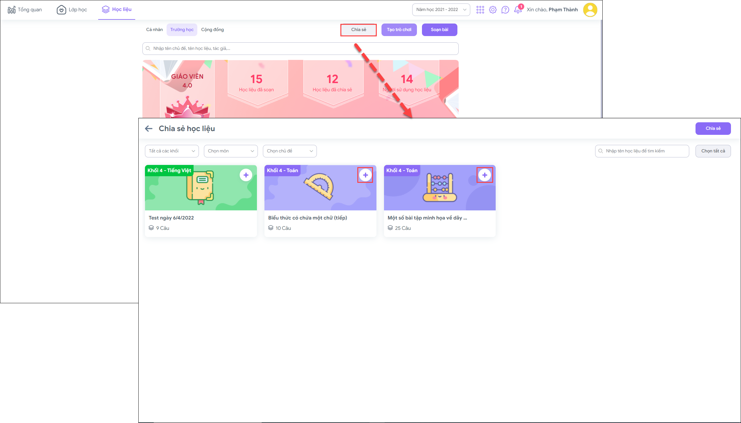 - Để chia sẻ học liệu cho giáo viên khác, thầy cô nhấn Chia sẻ. Chọn biểu tượng “+” tại học liệu thầy cô muốn chia sẻ.