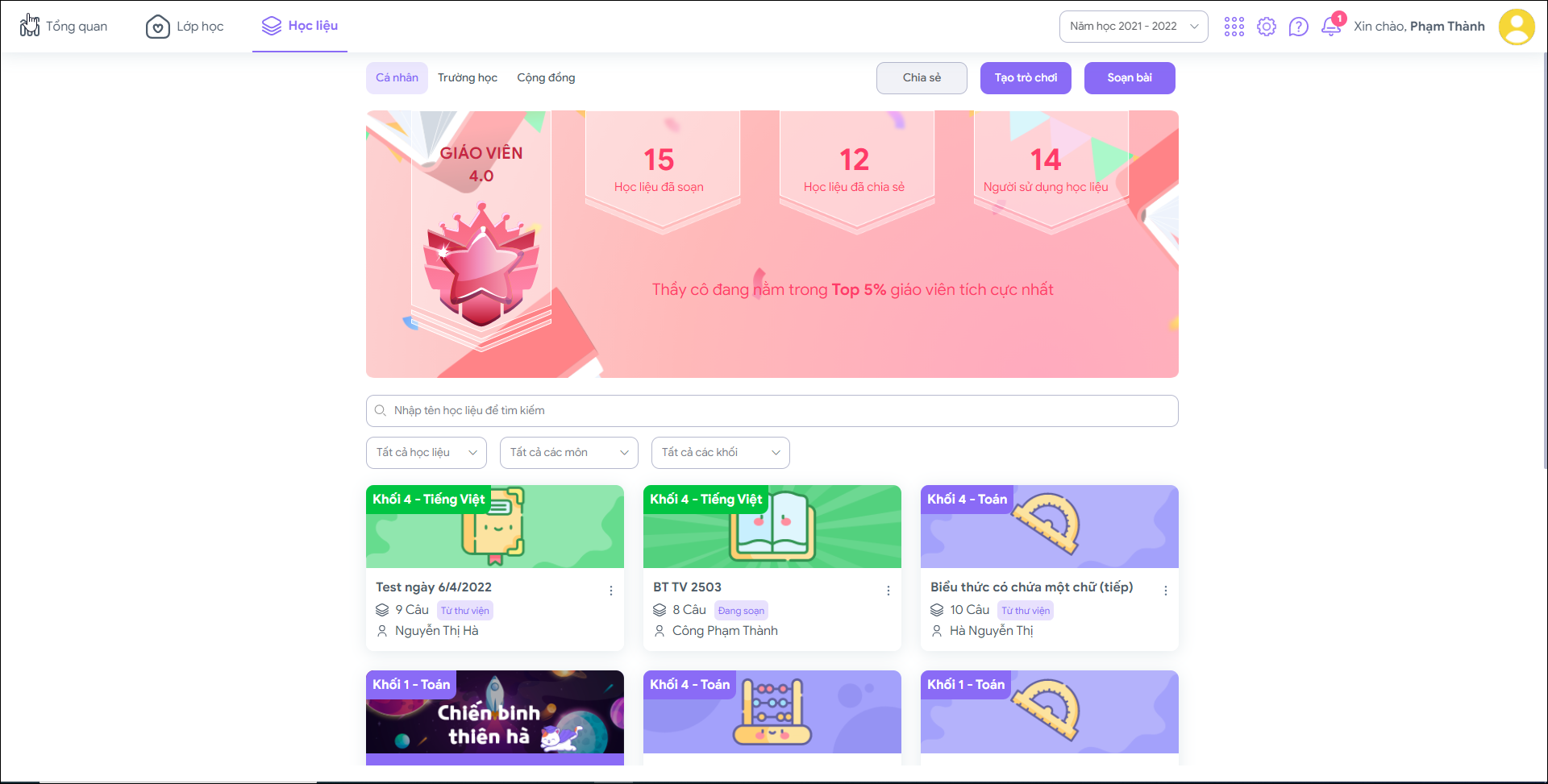 - Thầy cô vào Học liệu, tại đây, thầy cô xem được danh sách học liệu: Cá nhân, Trường học, Cộng đồng.