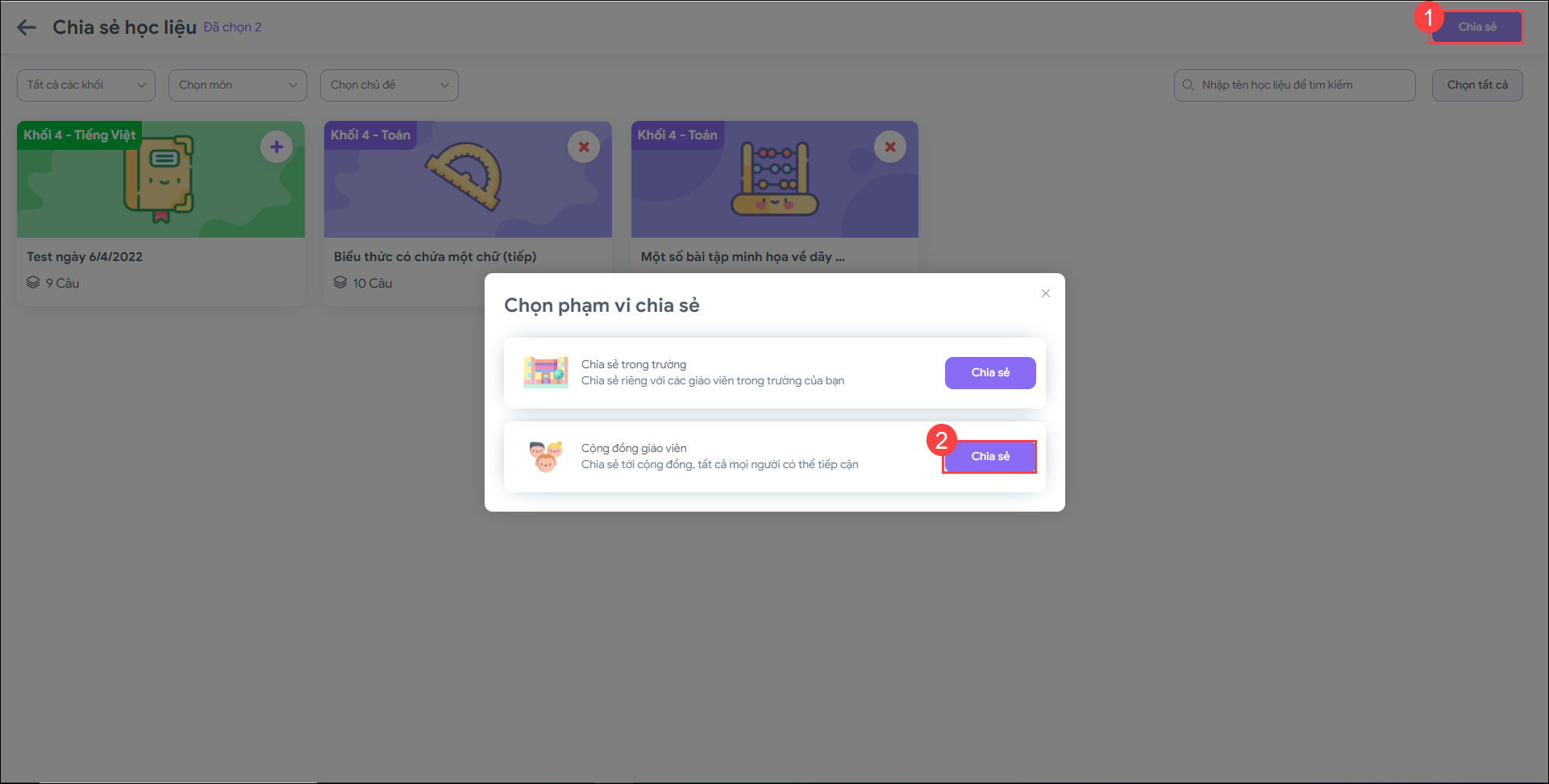 - Nhấn Chia sẻ học liệu, thầy cô chọn phạm vi chia sẻ: