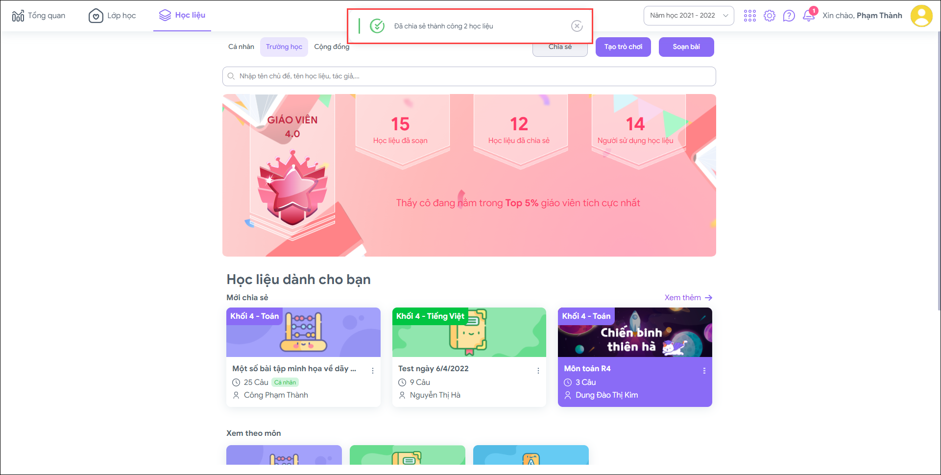 4. Học liệu chia sẻ thành công sẽ hiện lên thông báo.