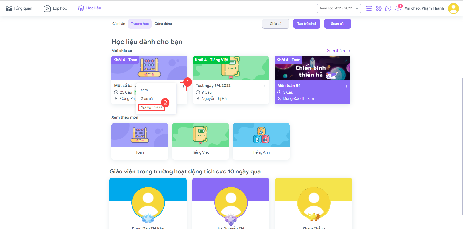5. Thầy cô cũng có thể ngừng chia sẻ học liệu bằng cách nhấn vào biểu tượng ba chấm, chọn Ngừng chia sẻ.