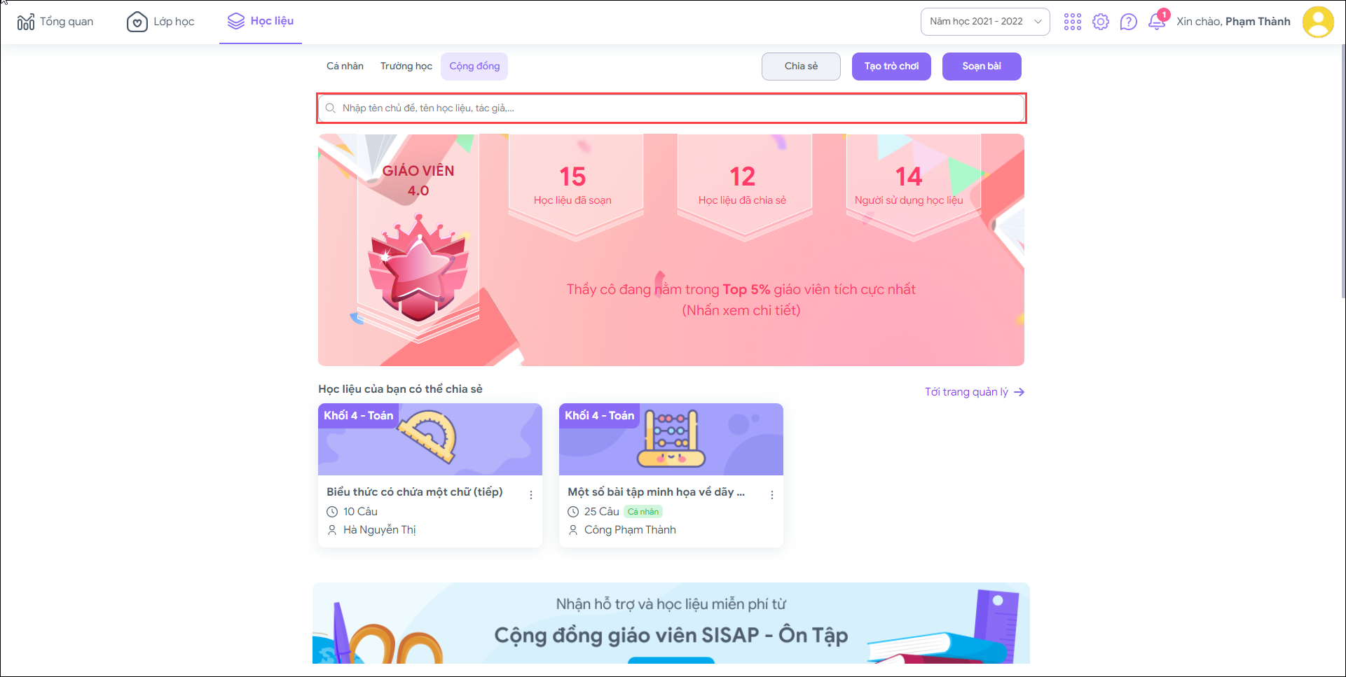 - Thầy cô có thể tìm kiếm nhanh học liệu cần tham khảo trên thanh tìm kiếm.
