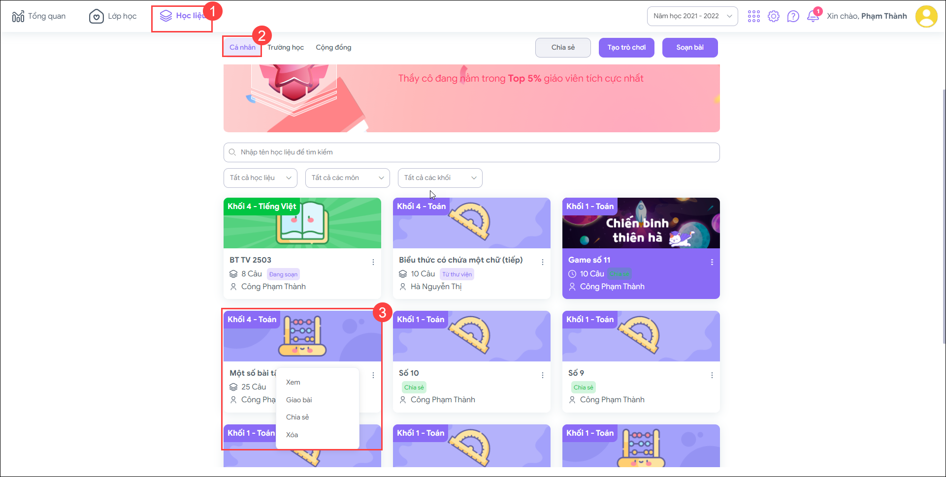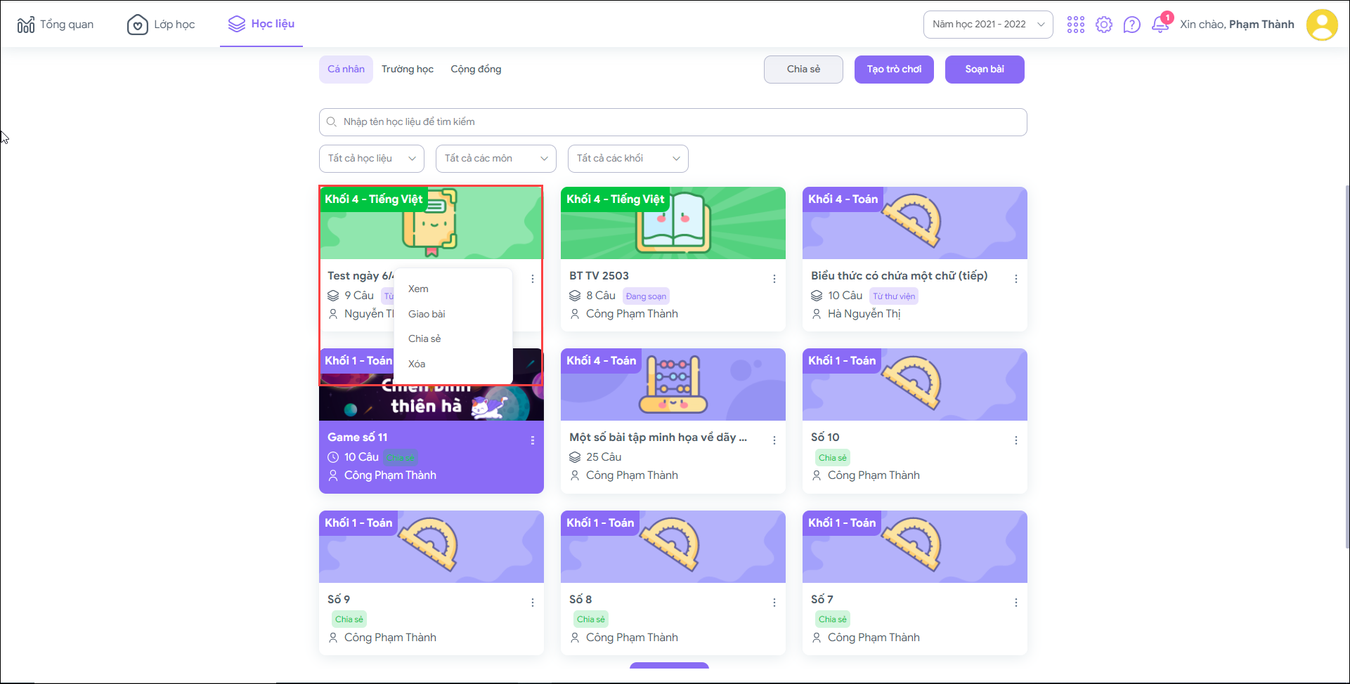 - Sau khi lấy học liệu về thành công, thầy cô có thể xem, xóa, chỉnh sửa học liệu, giao cho học sinh,…