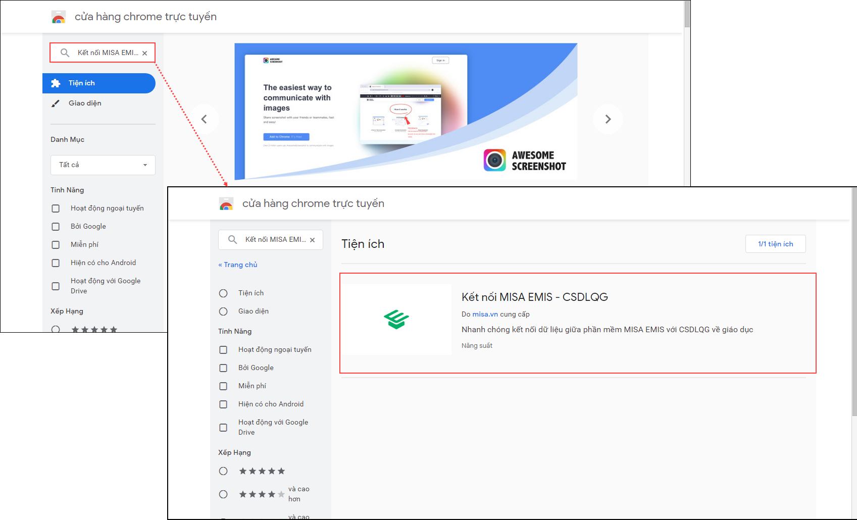 - Anh/chị truy cập vào đường link https://chrome.google.com/webstore/category/extensions và tìm kiếm công cụ với từ khóa Kết nối MISA EMIS – CSDLQG, sau đó chọn vào tiện ích kết quả hiện ra.