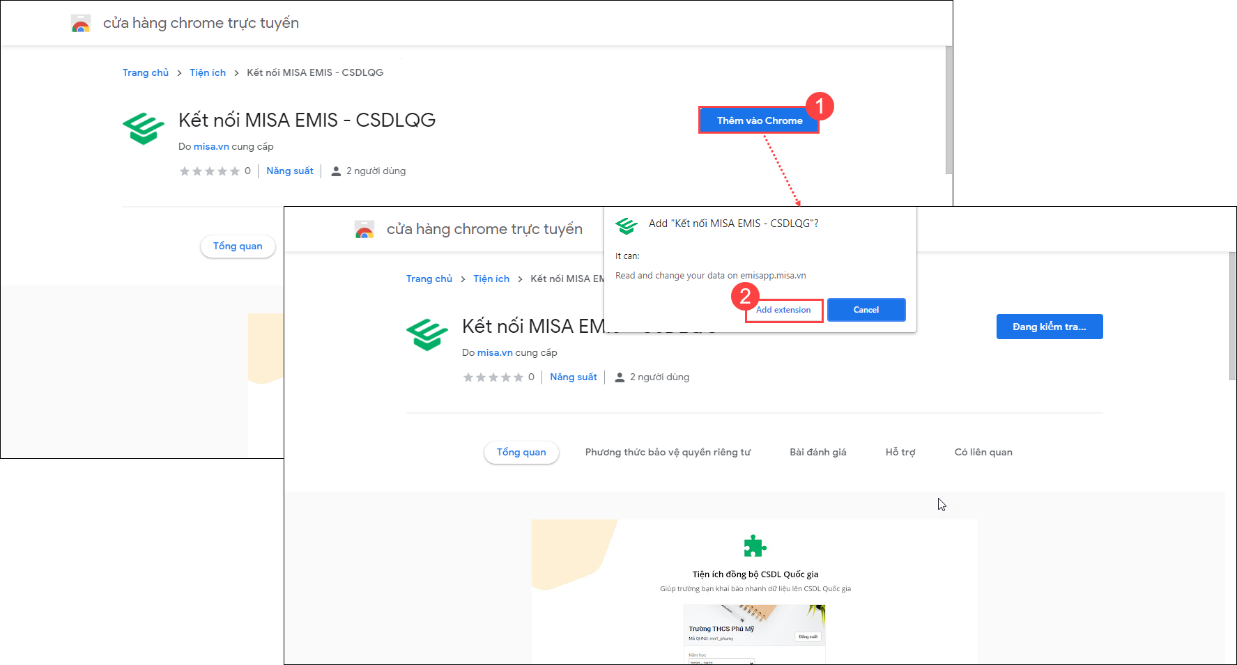 Giáo viên phụ trách cập nhật dữ liệu lên CSDLQG của trường thực hiện thiết lập tiện ích Kết nối MISA EMIS – CSDLQG ngay trên trình duyệt web (Chrome/Coccoc) tại máy tính thường sử dụng.
