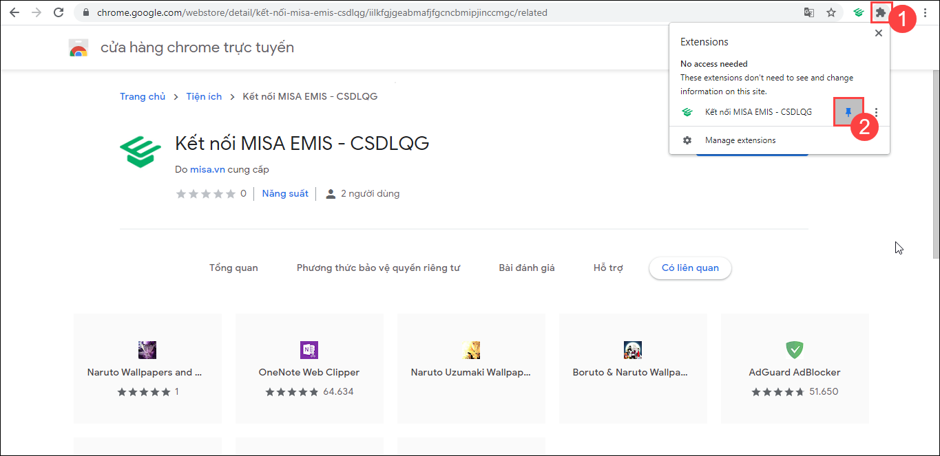 - Trên thanh công cụ của trình duyệt, nhấn vào Tiện ích, chọn Ghim tương ứng với tên tiện ích Kết nối MISA EMIS – CSDLQG để ghim tiện ích ra màn hình. Kết quả thực hiện như dưới đây.