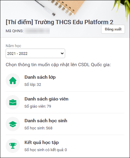 - Anh/chị chọn thông tin năm học và thông tin muốn xuất khẩu từ MISA EMIS để cập nhật dữ liệu tương ứng lên CSDLQG.