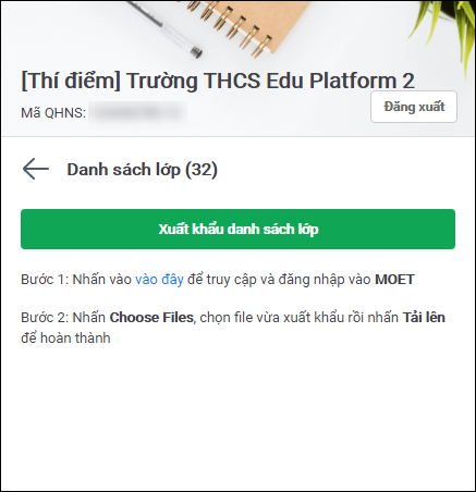 - Để xuất khẩu danh sách lớp học trong năm học đã chọn, anh/chị chọn Danh sách lớp, nhấn Xuất khẩu danh sách lớp để xuất khẩu dữ liệu tương ứng trên MISA EMIS. Sau đó, thực hiện tải file xuất khẩu lên CSDLQG theo hướng dẫn được hiển thị trên tiện ích.