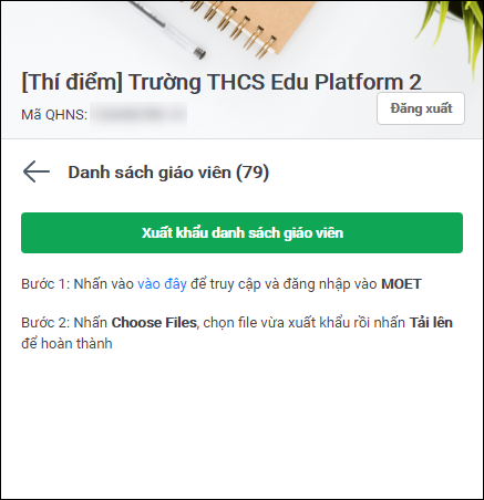 - Để xuất khẩu danh sách giáo viên trong năm học đã chọn, anh/chị chọn Danh sách giáo viên, nhấn Xuất khẩu danh sách giáo viên để xuất khẩu dữ liệu tương ứng trên MISA EMIS. Sau đó, thực hiện tải file xuất khẩu lên CSDLQG theo hướng dẫn được hiển thị trên tiện ích.